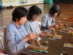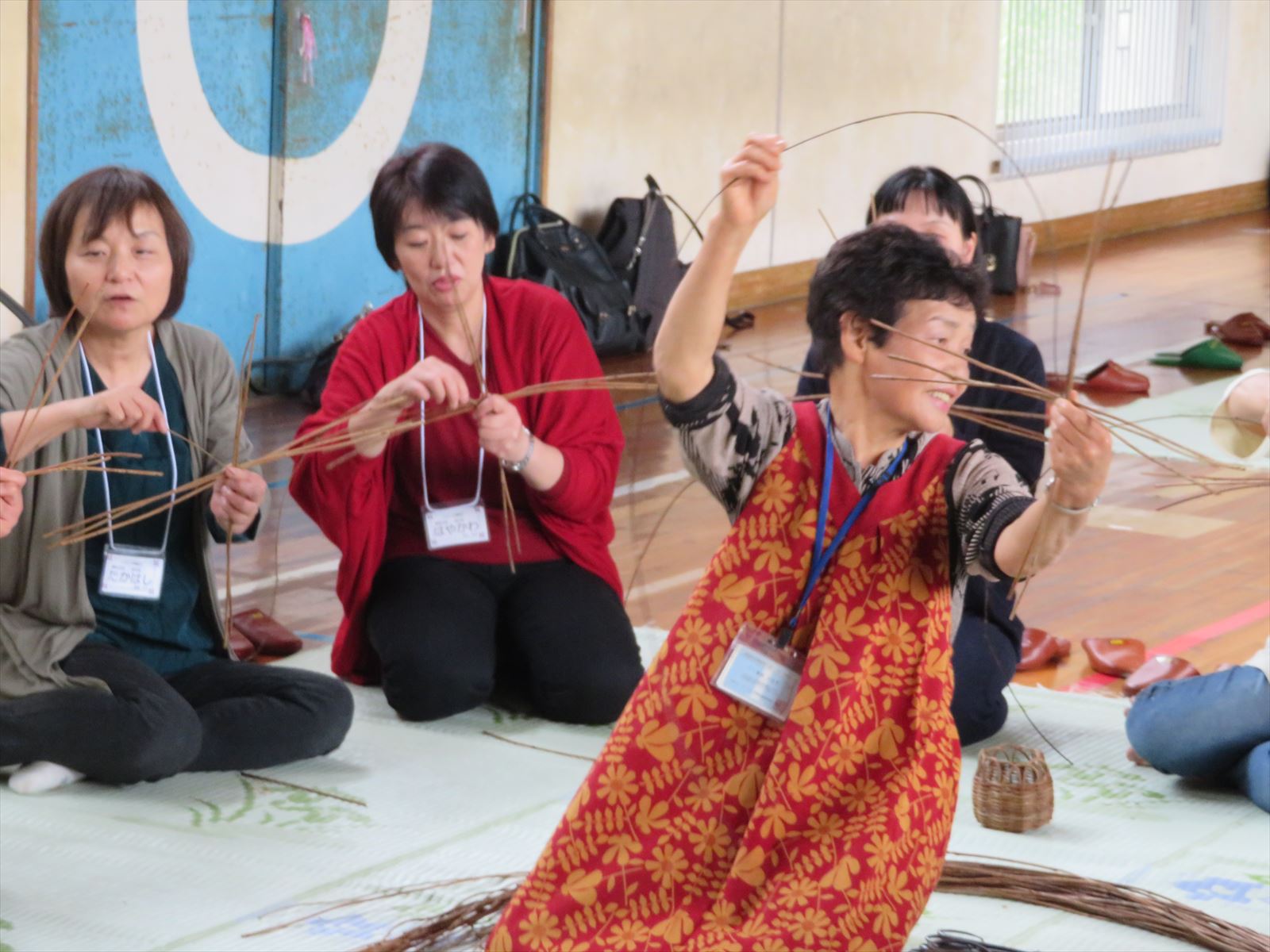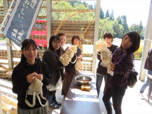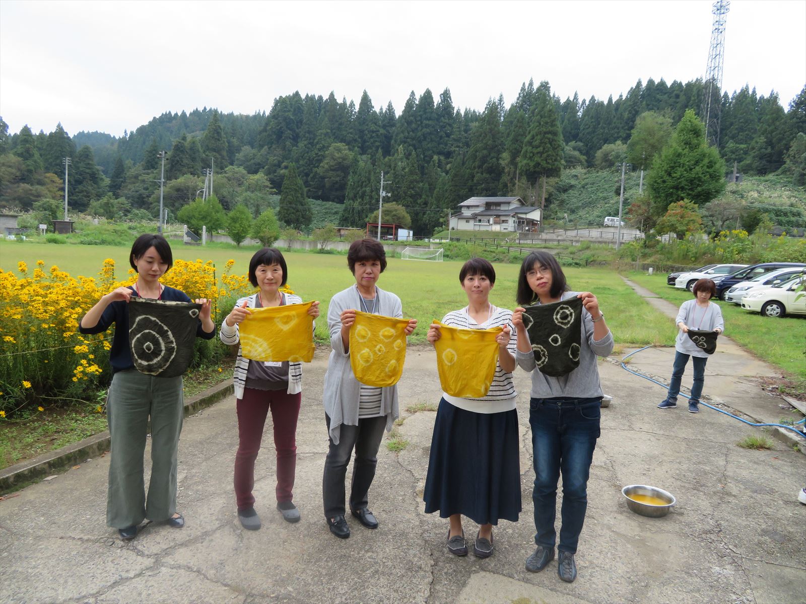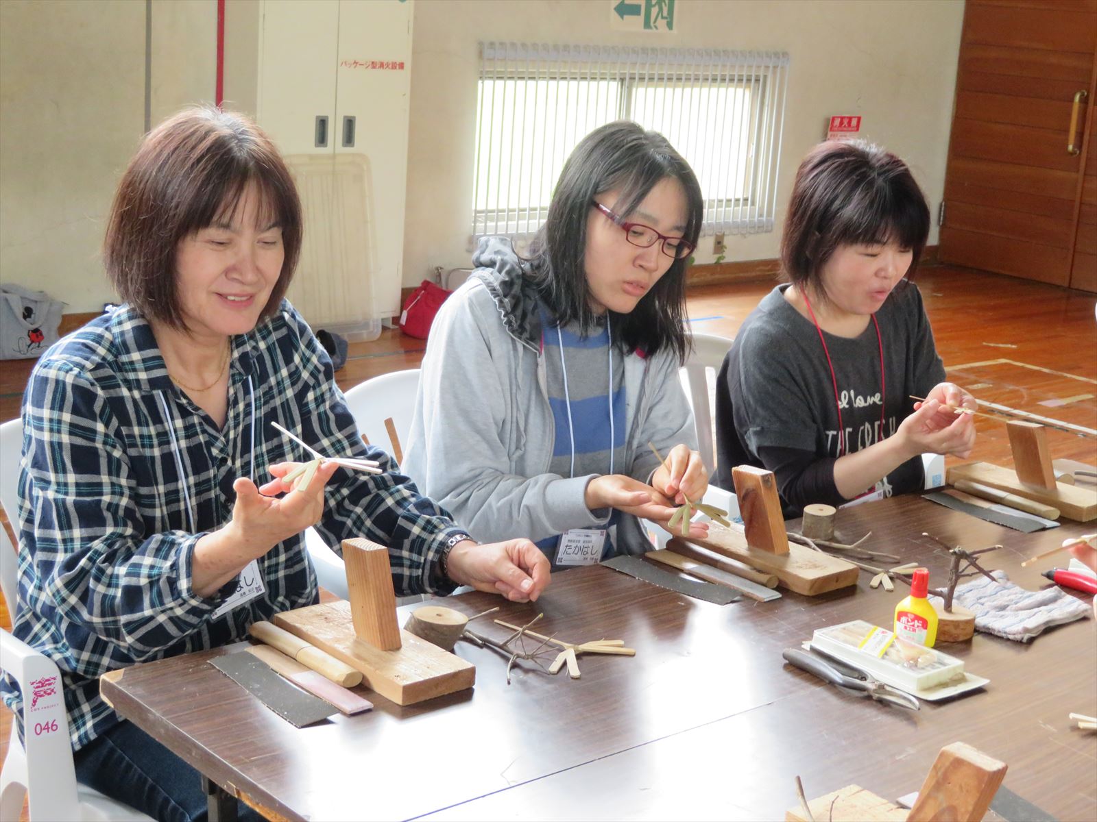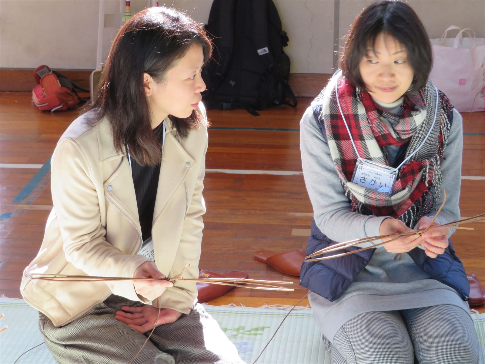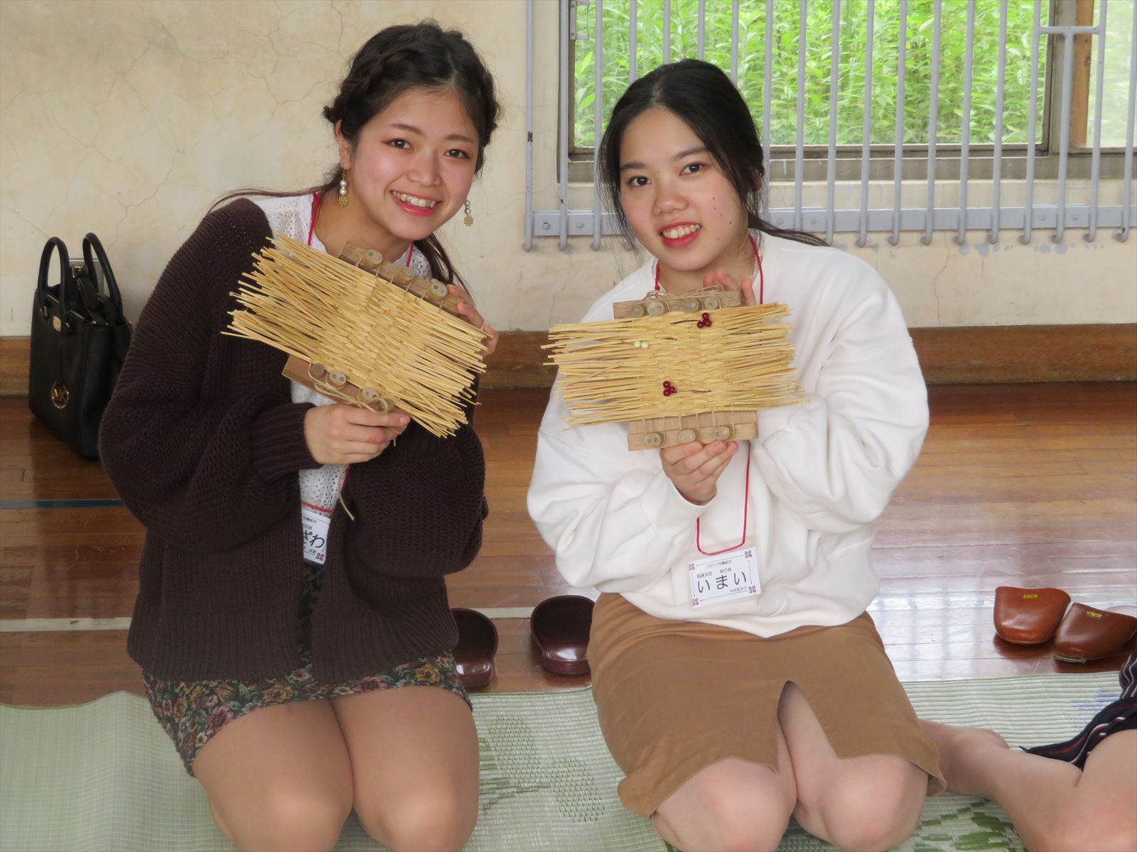 月影の郷では「わら細工(ワラマットづくり)」「草木染め」「あけびづる細工(カゴづくり)」「ゆらゆらとんぼづくり」の4グループに分かれて工芸体験を行いました。限られた時間ではありましたが,スタッフのみなさんが親切に教えて下さり,世界にひとつ自分だけの作品を作ることができました。