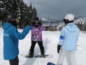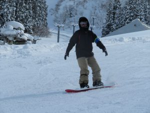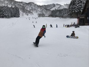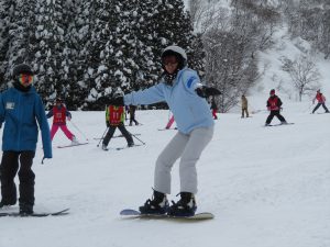 スノーボードの「初心者」は初めてスノーボードをする方が対象で、スノーボードの装着方法から、ワンフットでの滑走、スノーボードの止まり方まで教わり、最後はリフトに乗って滑走しました。