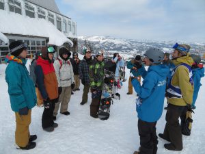 「初級」はスノーボードをはじめて2~3回くらいの経験で初級者用の斜面でターンができる方が対象で、滑走の基礎からワンフットでの滑走、そしてターンの練習を重点に行いました。