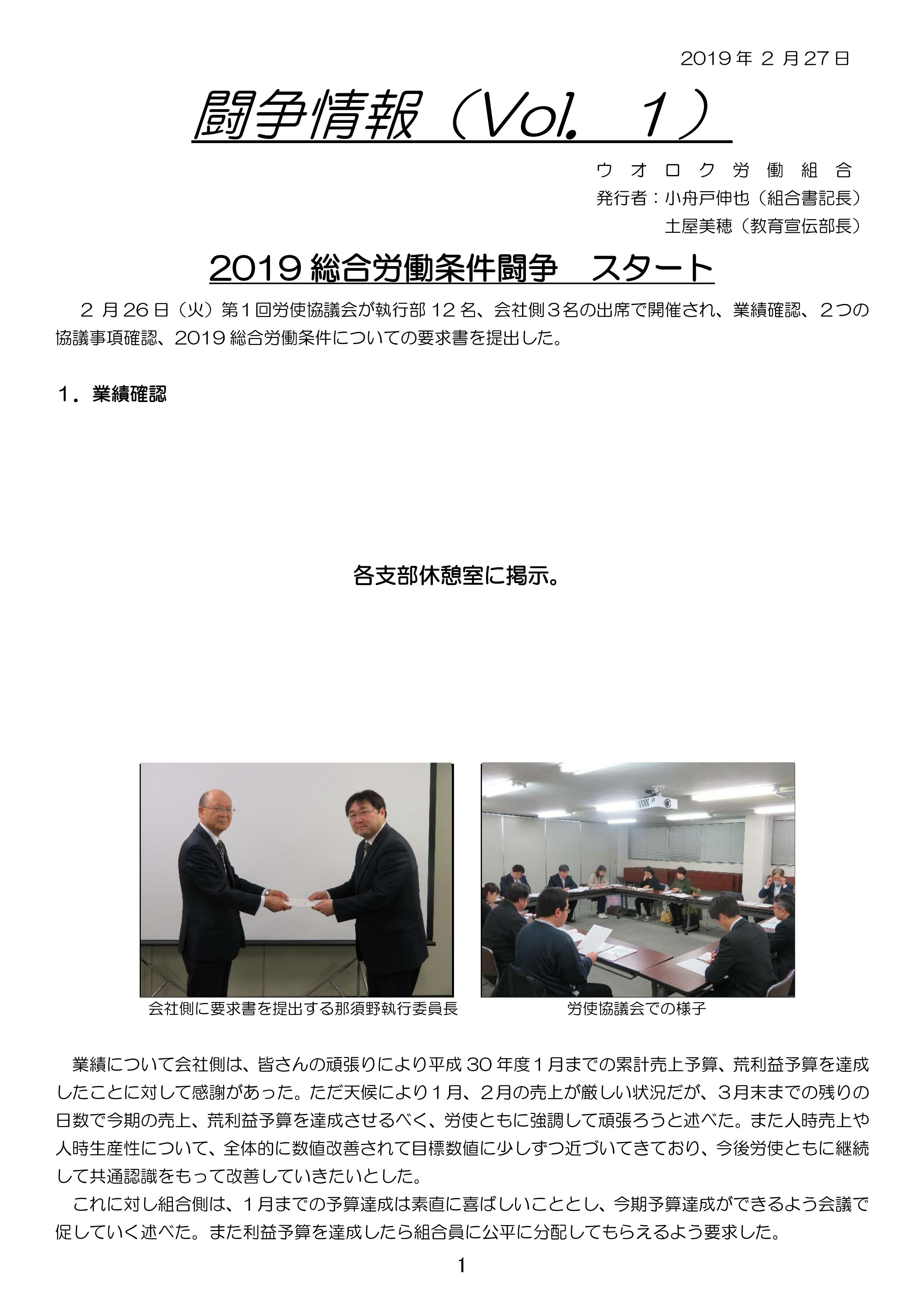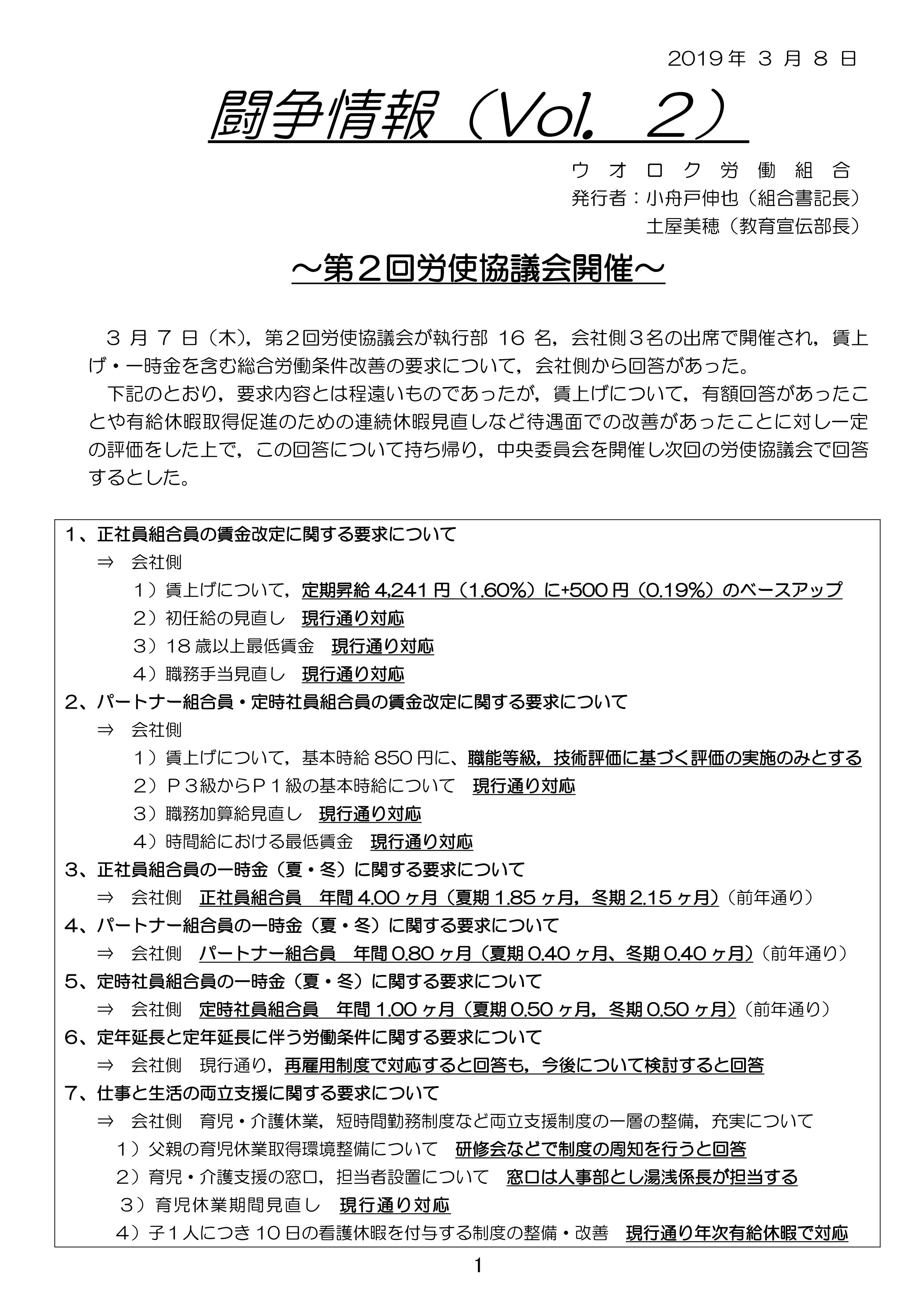 2月26日(火)第1回労使協議会が執行部12名、会社側3名の出席で開催され、業績確認と2点の協議事項、そして2019総合労働条件についての要求書を提出しました。