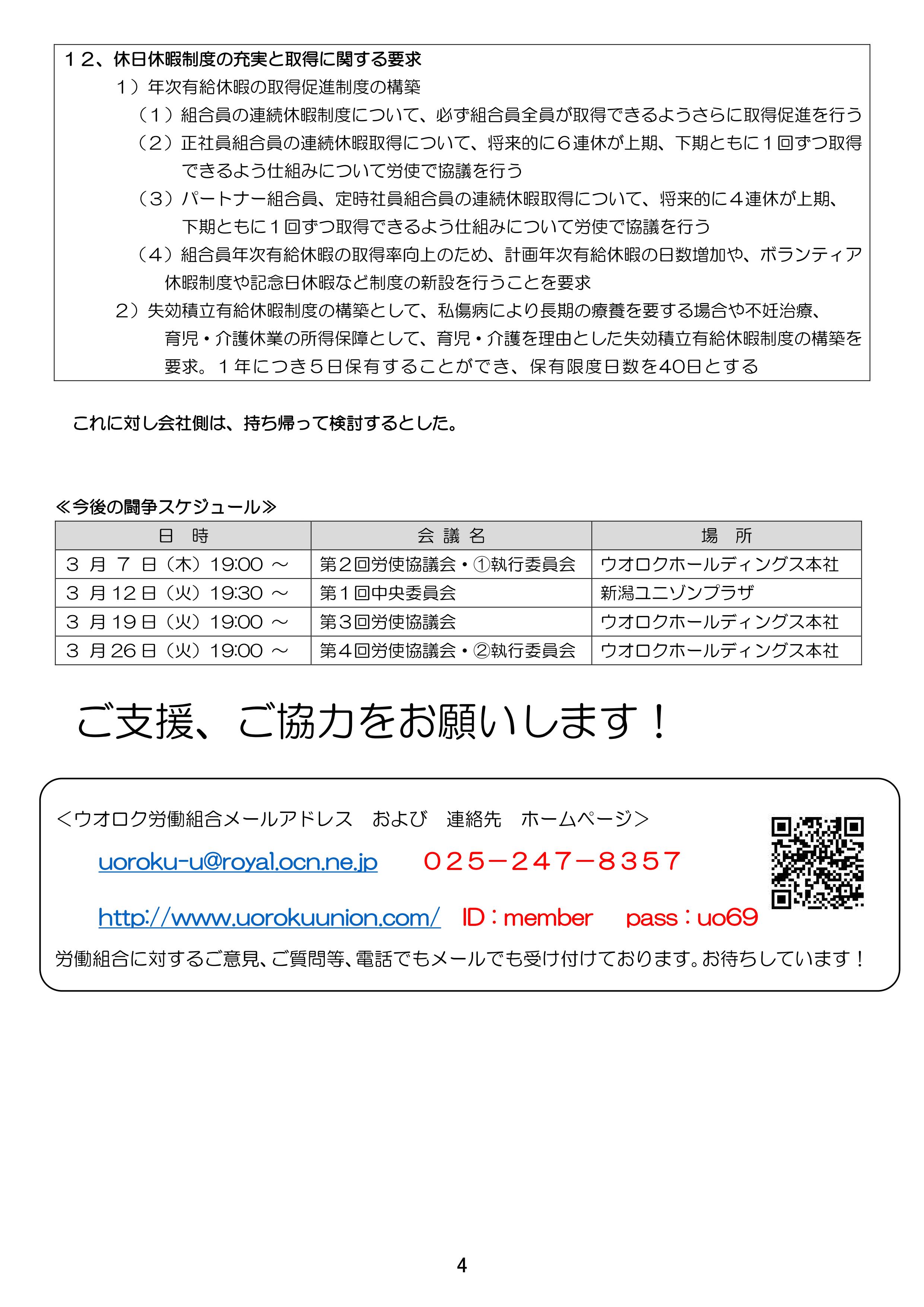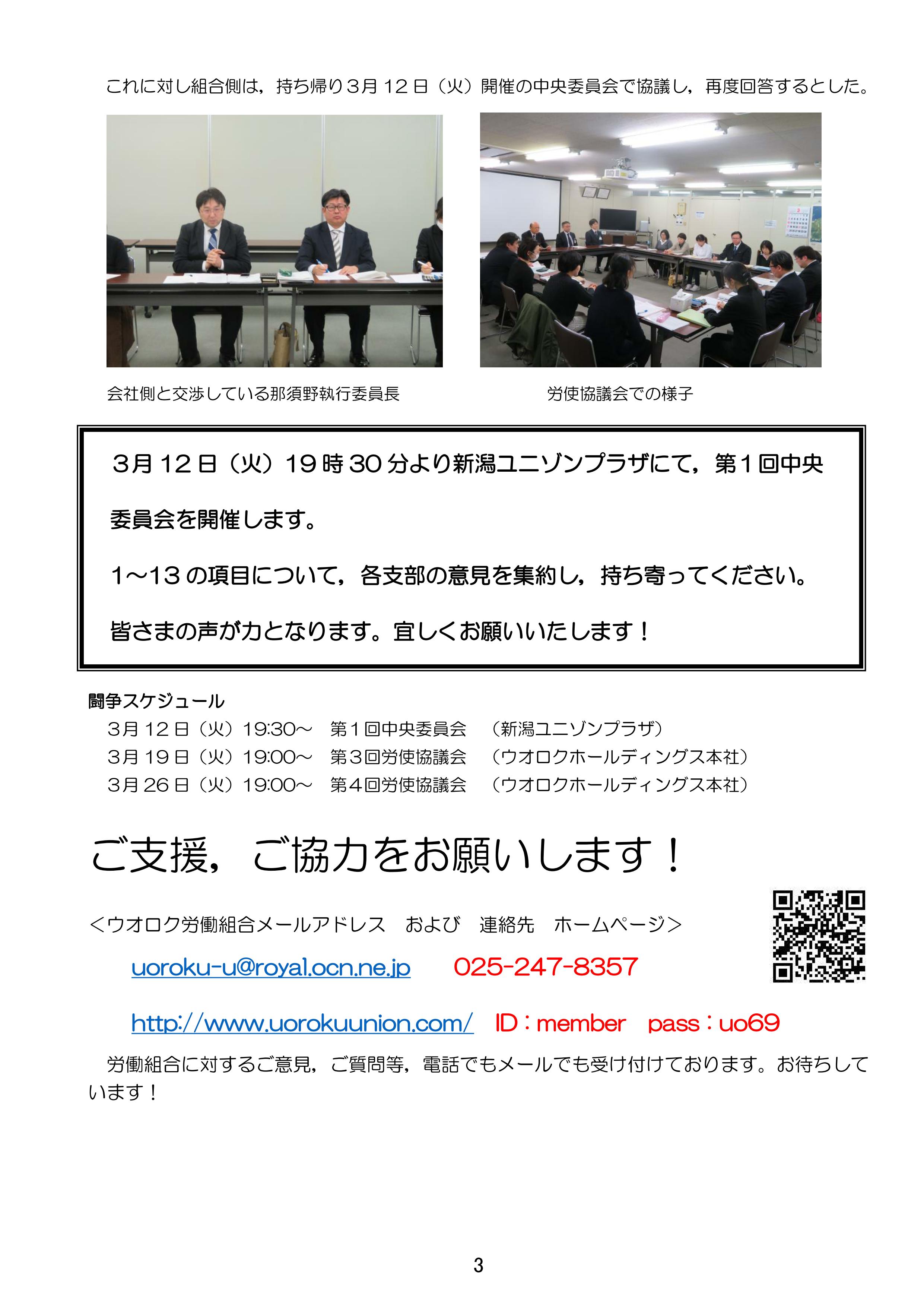3月26日(火)第4回労使協議会 19:00~ 場所:ウオロクホールディングス本社