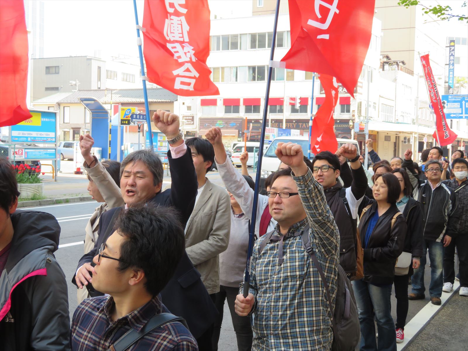 朝8:30から,中央区にある他門川公園をスタートし,シュプレヒコール(スローガン)を唱和をしながら新潟市街をデモ行進し,「長時間労働の撲滅」や「格差の根絶」などを要求しました。