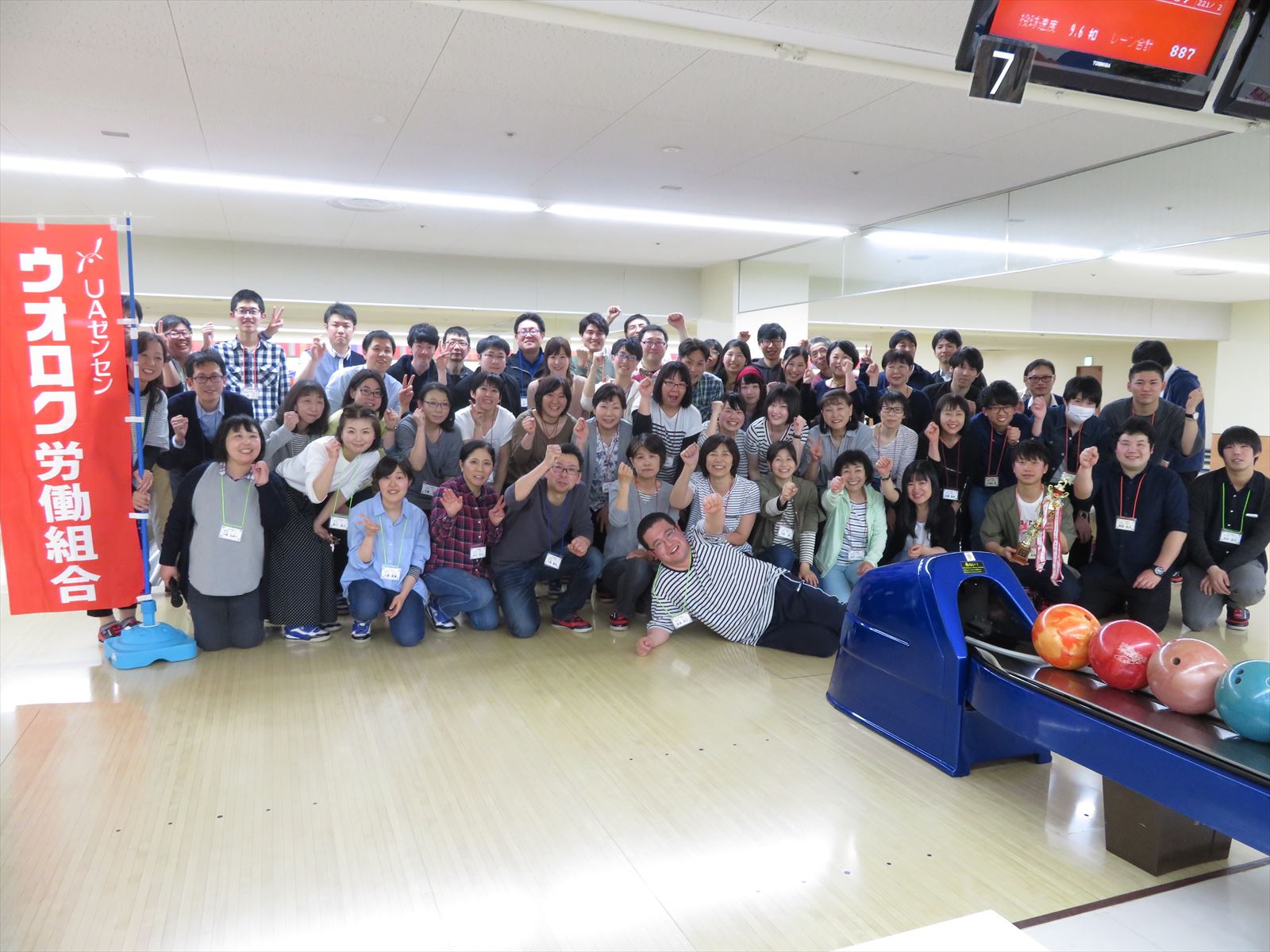 5月9日(水),「POPBOWL長岡」にて,職場の仲間づくりと新入社員の歓迎を兼ねて,「第7回ボウリング大会in中越」を開催し,中越地区過去最高の7支部51名と執行部12名の計63名が参加しました。うち12名が新入社員,中間社員でした。