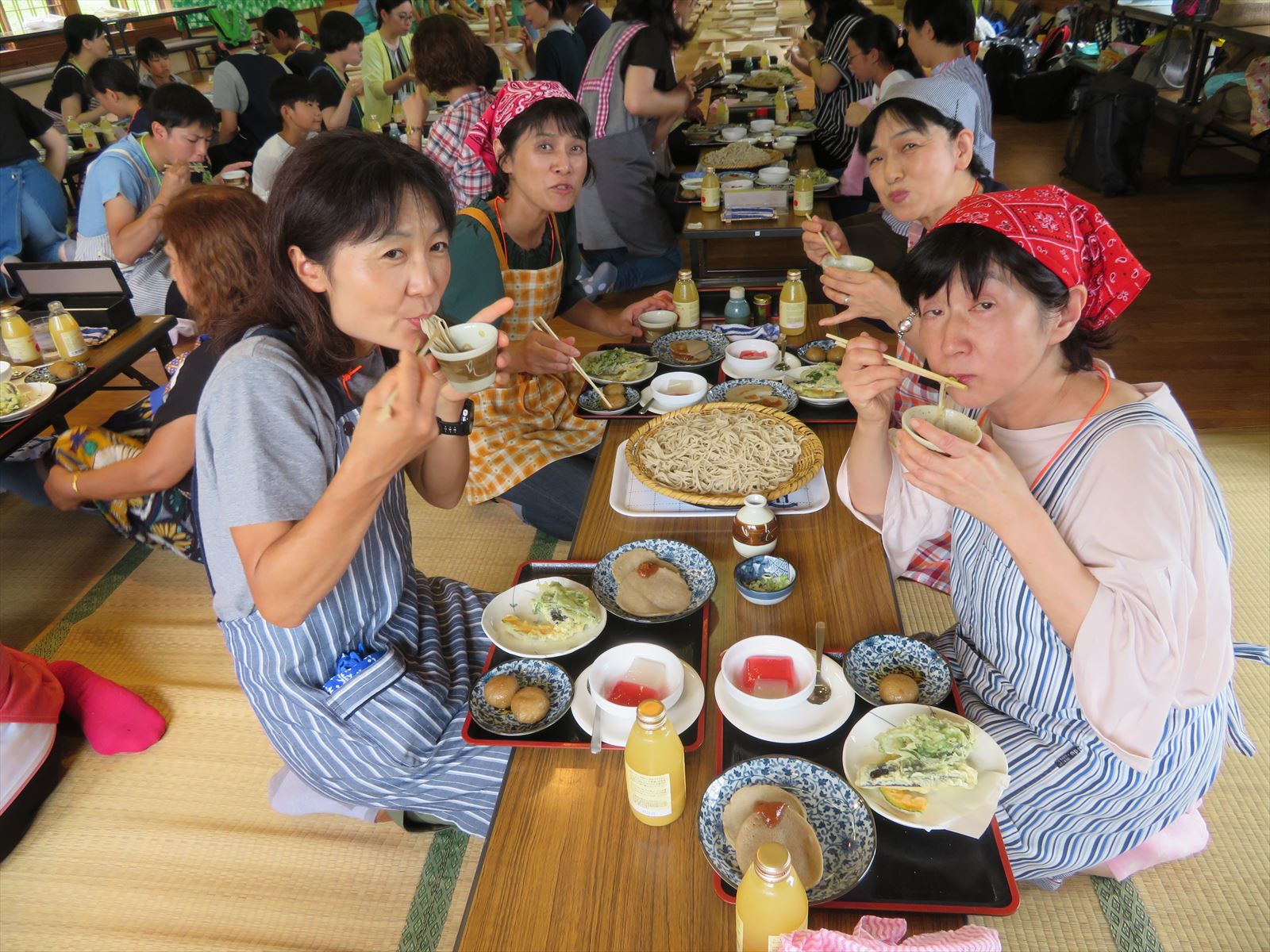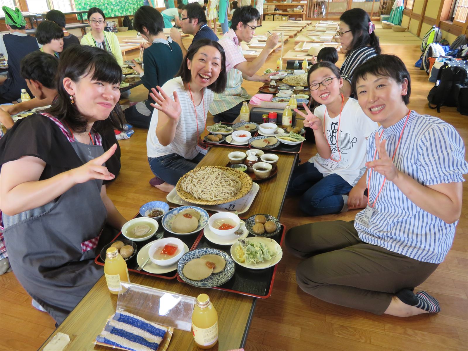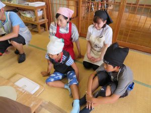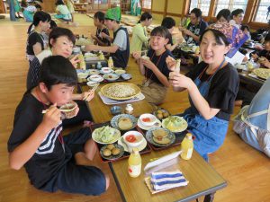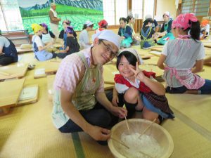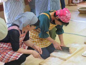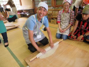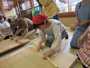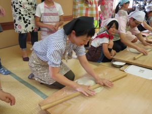 はじめに「戸隠そば博物館とんくるりん」で4人一組のグループに分かれ,そば打ち体験を行いました。初めてのそば打ち体験に苦戦する場面もありましたが,親切丁寧な指導の下,大人も子どもも楽しんでいました。また,実際に自分で打ったそばは昼食で頂くことができました。自分で打ったそばの味は格別で,同じ材料で同じように作っていても,グループごとにそばの太さが違い,味比べに盛り上がる様子も見受けられました。