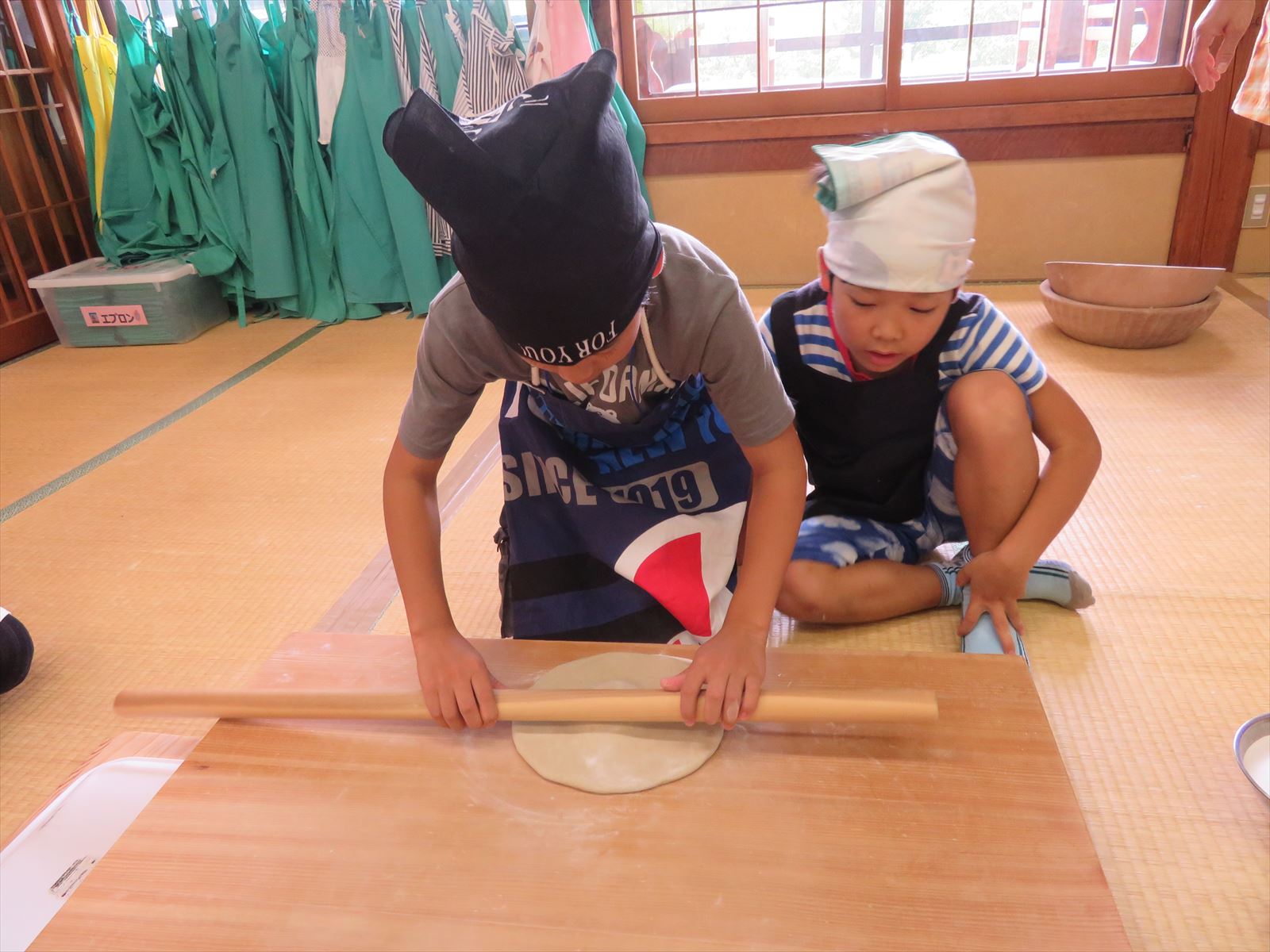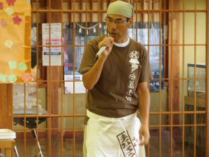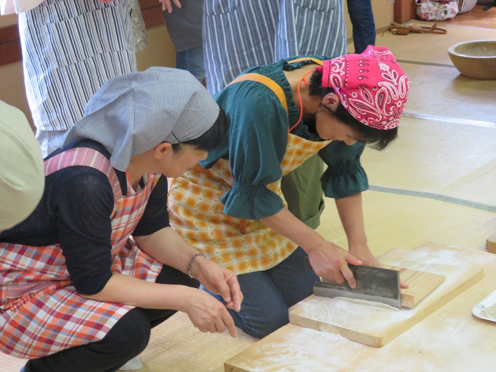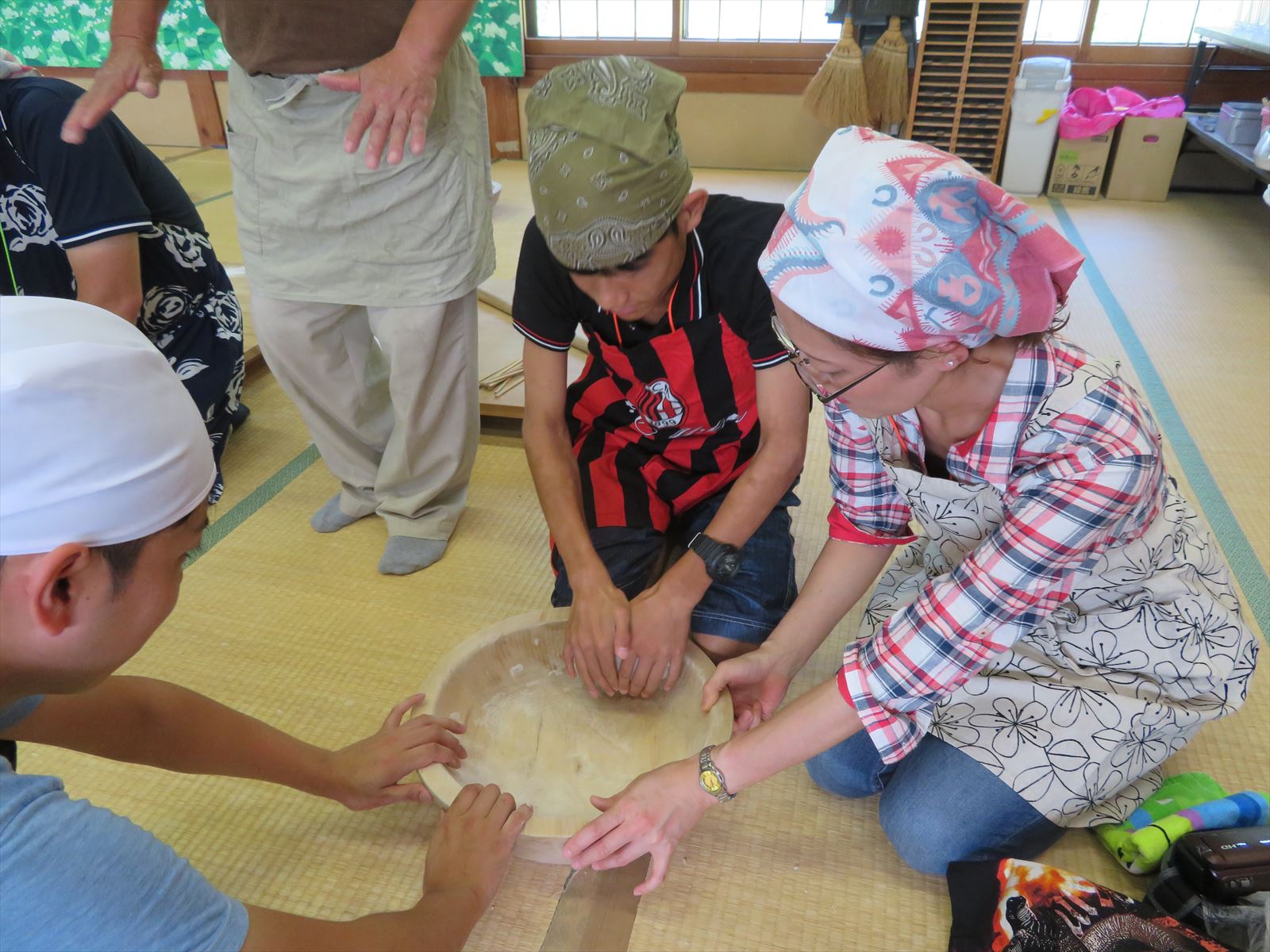 はじめに「戸隠そば博物館とんくるりん」で4人一組のグループに分かれ,そば打ち体験を行いました。初めてのそば打ち体験に苦戦する場面もありましたが,親切丁寧な指導の下,大人も子どもも楽しんでいました。また,実際に自分で打ったそばは昼食で頂くことができました。自分で打ったそばの味は格別で,同じ材料で同じように作っていても,グループごとにそばの太さが違い,味比べに盛り上がる様子も見受けられました。
