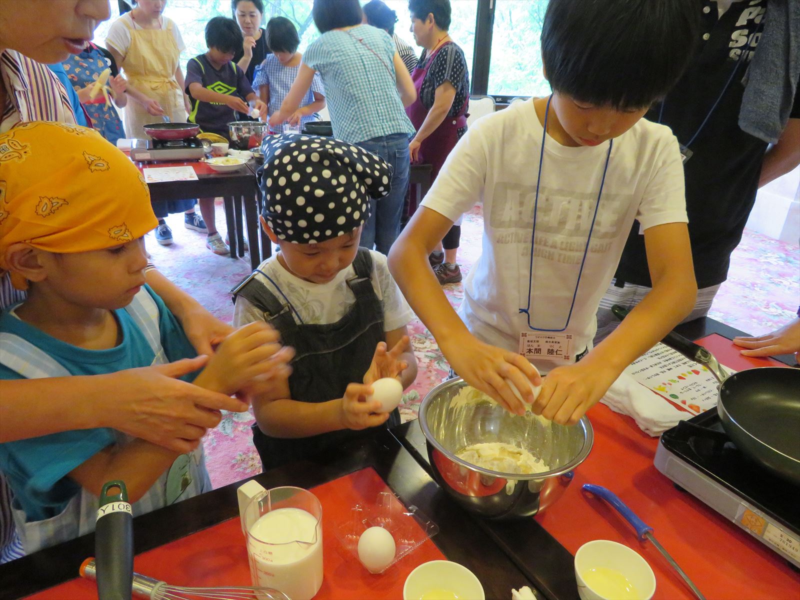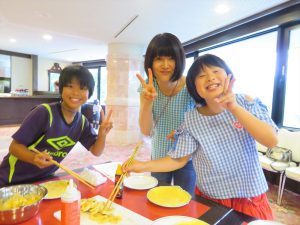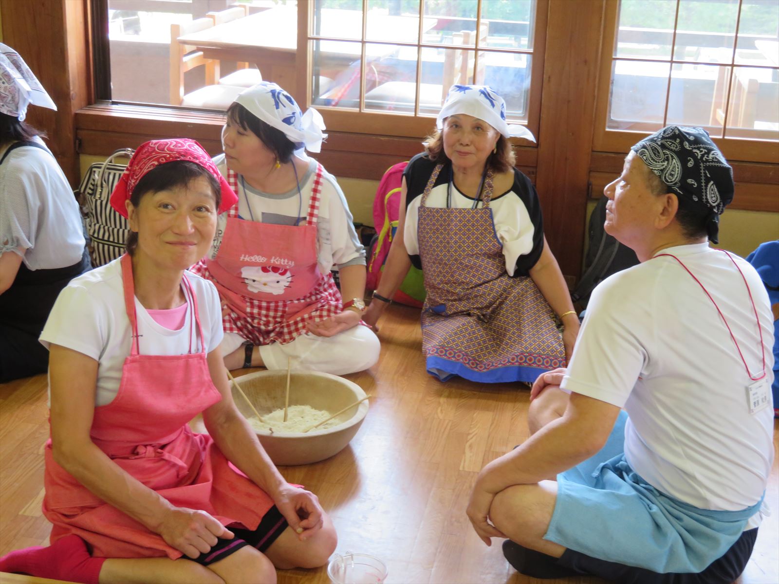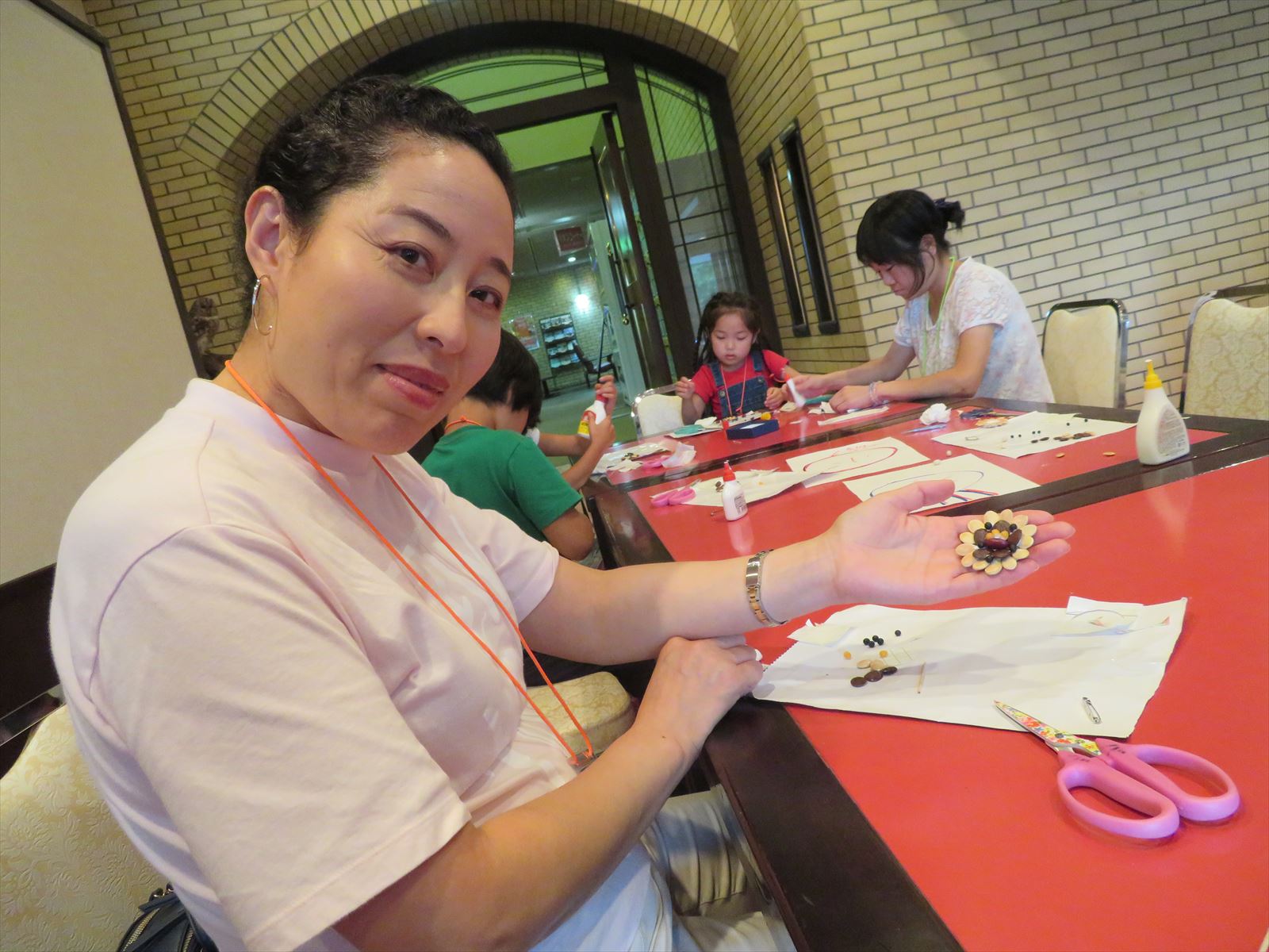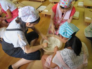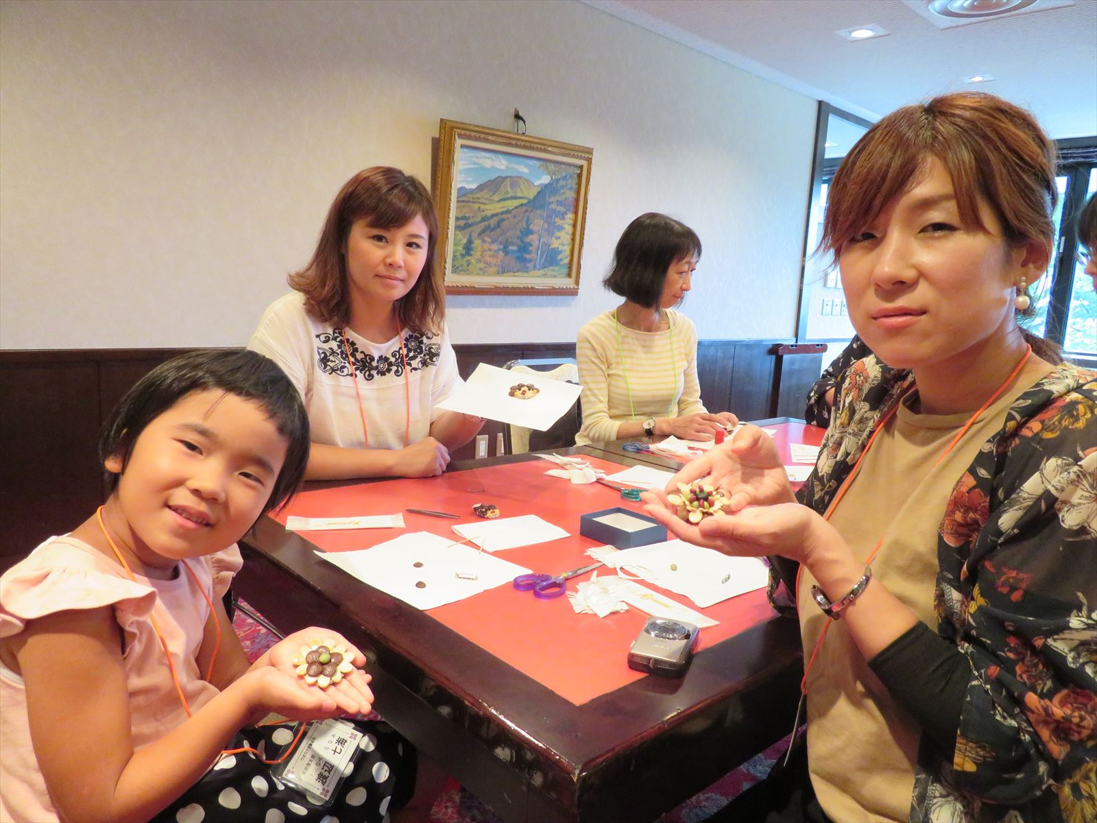 昼食後は,日帰り入浴・胎内昆虫の家見学・米粉スイーツ作り体験・種のブローチ体験に分かました。特に、米粉スイーツ作りと種のブローチ作りといいた体験型のコースは子どもの参加者に好評でした。