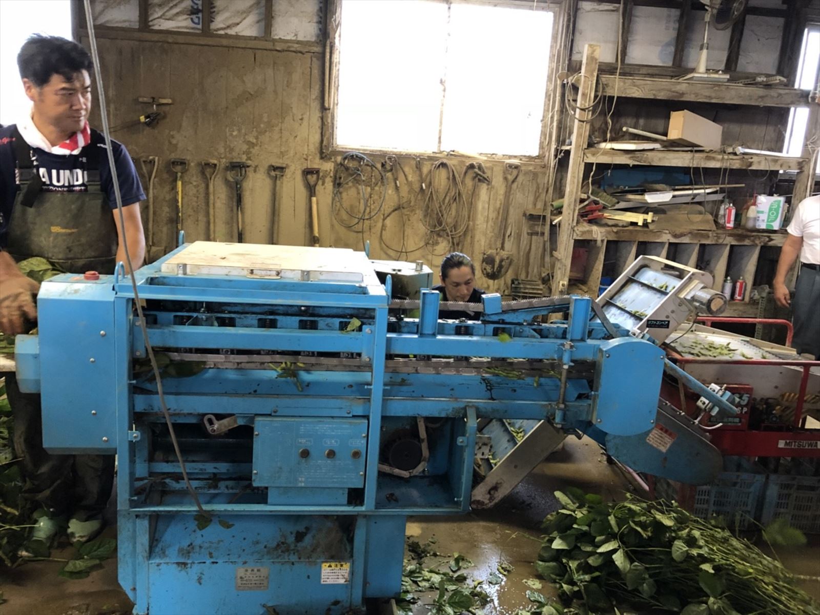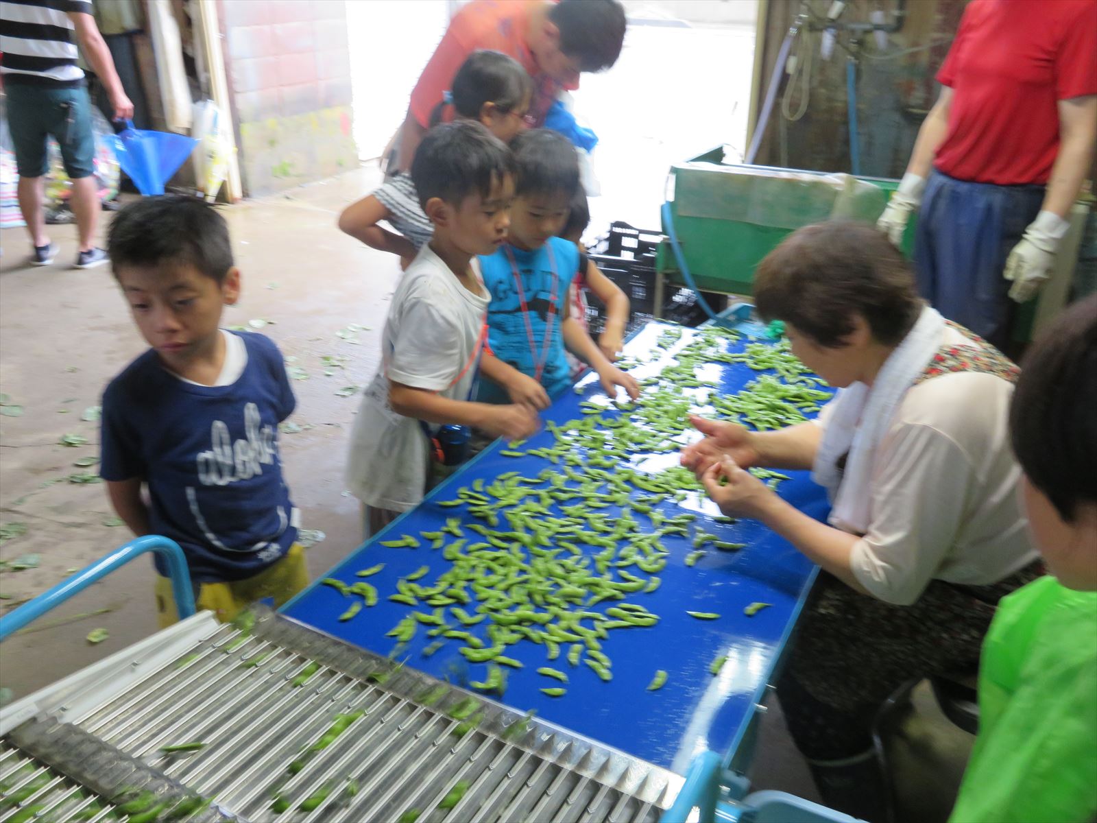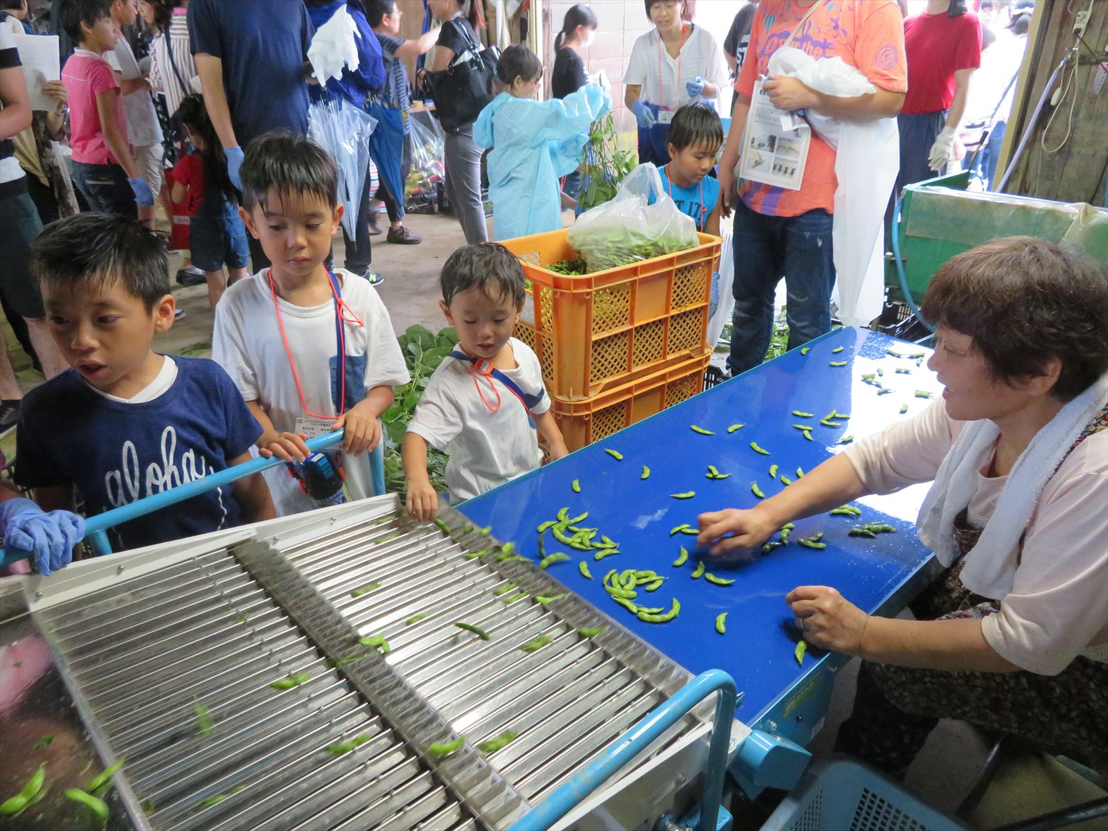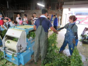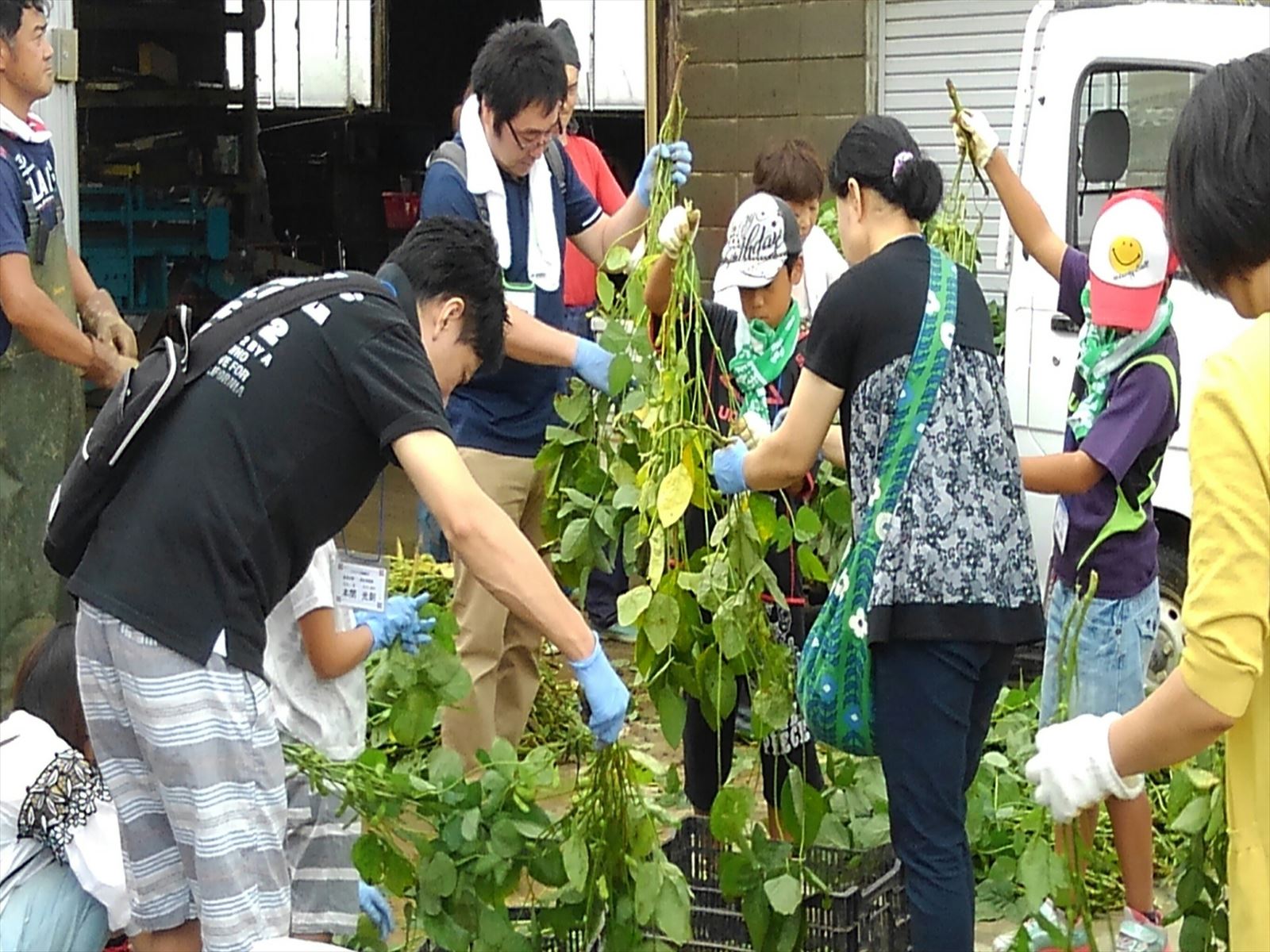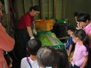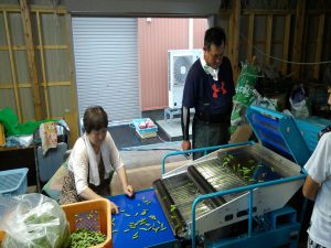 はじめに,契約農場を営んでいる㈱本間商事さんの黒鳥枝豆研究所を訪れ,茶豆や他の野菜などの収穫物を加工する場所を見学させていただきました。あいにく雨のため,畑に入っての収穫体験はできませんでしたが,研究所での脱さや機での豆もぎの様子を見せていただきました。また,豆のついたままの枝から直接皆さんの手で豆もぎ体験を行いました。自分で枝からもいだ豆と,㈱本間商事さんで採れた「くろさき茶豆」をおみやげとしていただきました。㈱本間商事の皆さん,ご配慮いただきありがとうございました。