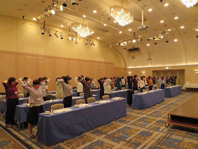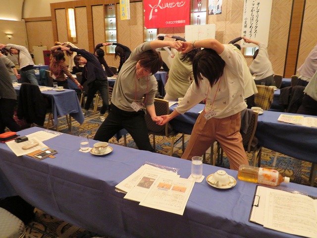 今回の講演は「疲れにくいカラダ!太りにくいカラダ!そしてリラックス!~まずは,ここからはじめよう~」と題しまして,フリーアナウンサーで健康管理士・「活脳塾」塾長の小久保 晴代さんをお招きし,講演を行っていただきました。40代以降太りにくい体を作るには,ただ運動してカロリーを消費するのではなく基礎代謝を上げることが重要で,基礎代謝は筋肉をつくることで上がるという内容について講演していただき,また下半身のむくみ解消法,腰回りの脂肪を燃焼させるエクササイズなどを会場で実演していただきました。ご講演終了後,参加者から「講演会の内容も日々に活かせそうで年齢的にも関心のあることでよかった。懇親会も先生と同じテーブルでいろいろお話しを聞くことができてよかった」「一緒に体験できてわかりやすく有意義だった」「大変ためになりました。改めて自分の体を整えたいと思いました」などの感想をいただきました。