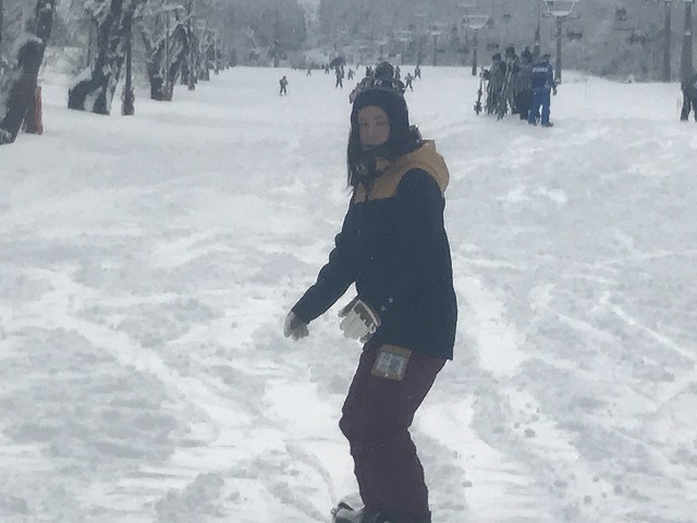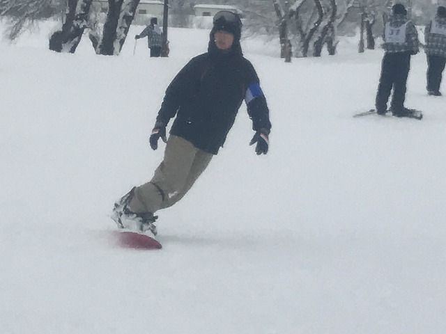 現地は深々と雪が降り積もる状況で、時折、吹雪に見舞われる悪天候でしたが、「もっとスノーボードがうまくなりたい!」という思いが強いこともあって、参加者全員、悪天候をものとせず必死に講習を受けておりました。