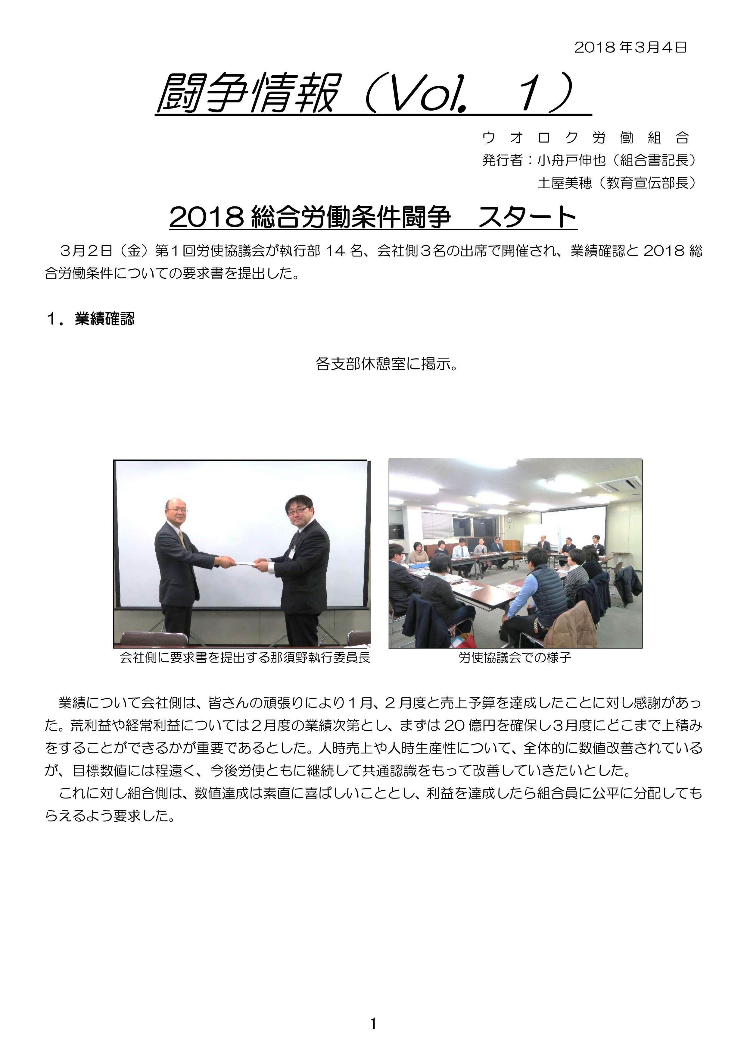 3月2日(金)第1回労使協議会が執行部13名、会社側3名の出席で開催され、業績確認と2018総合労働条件についての要求書を提出しました。