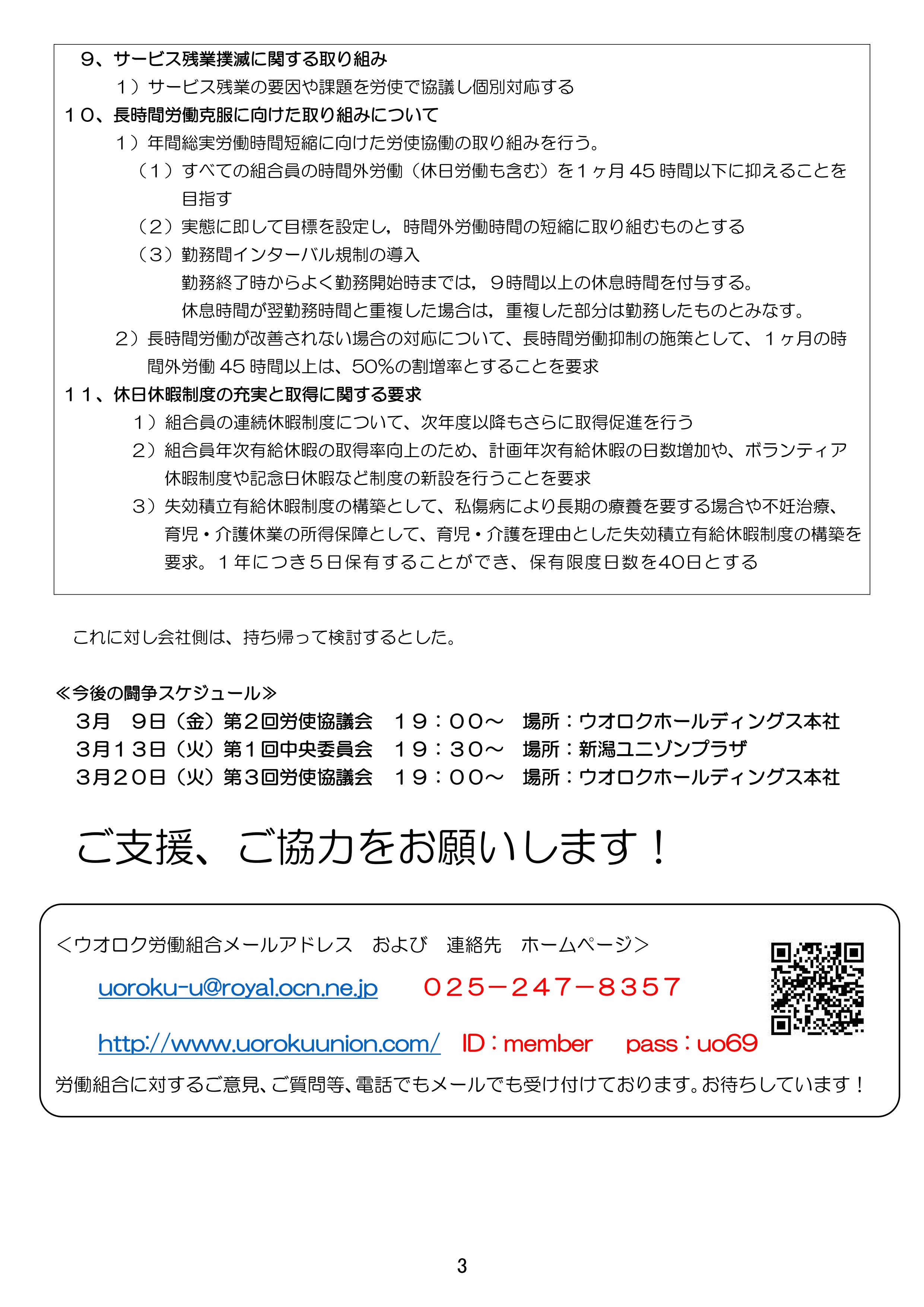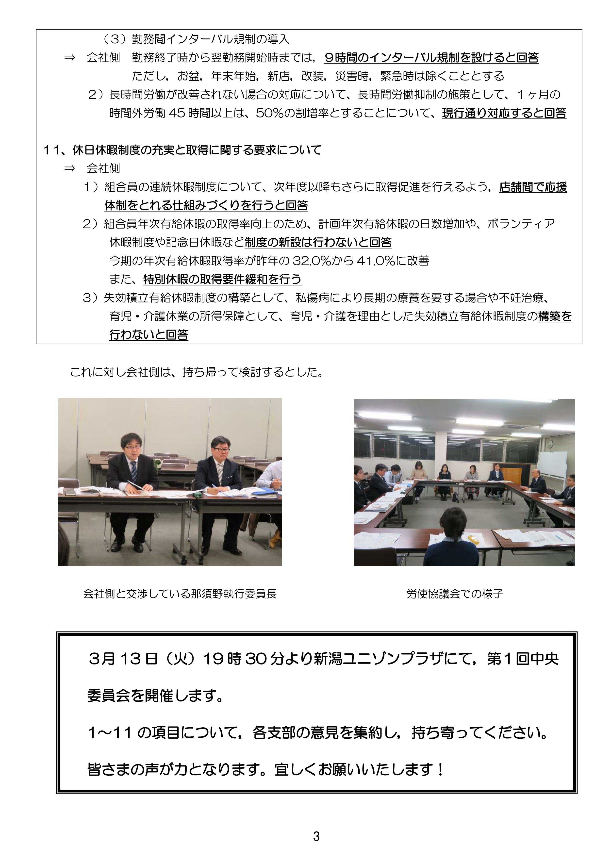 人員確保への対策や新潟県最低賃金との差が少なくなっていることを考慮し,正社員組合員同様にさらなるベースアップを再度要求しました。これに対し会社側は,持ち帰って検討するとのことです。