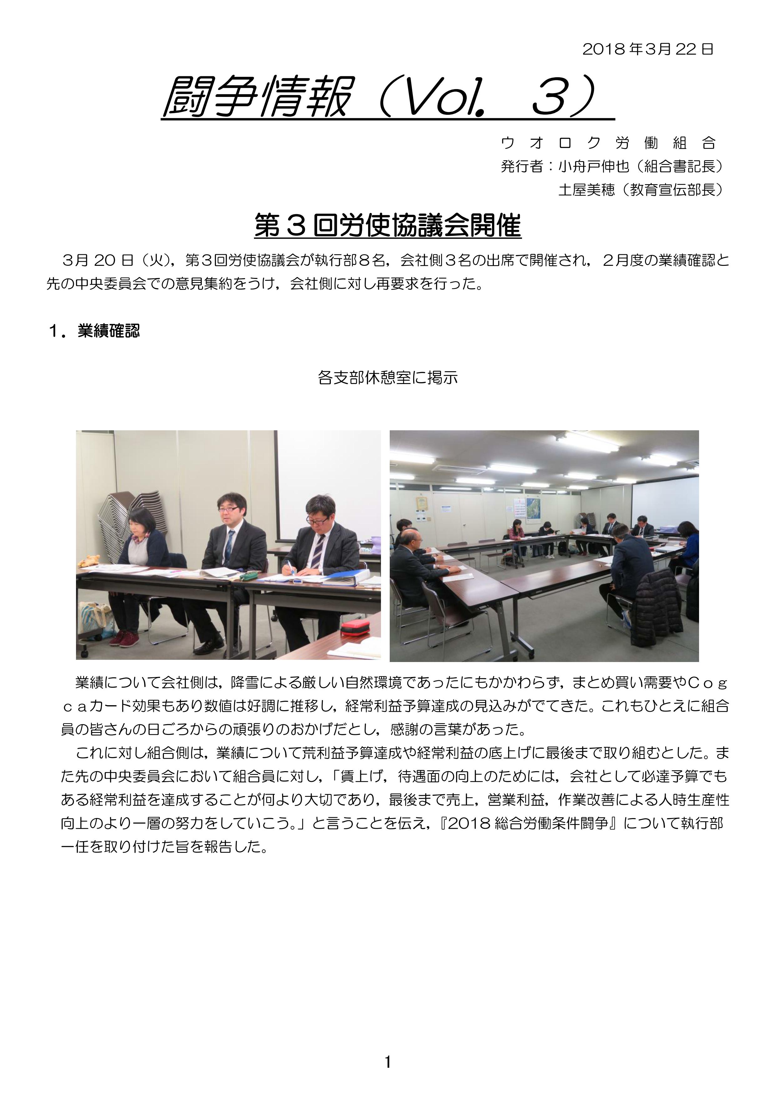 3月20日(金)第3回労使協議会 19:00~ 場所:㈱ウオロクホールディングス本社