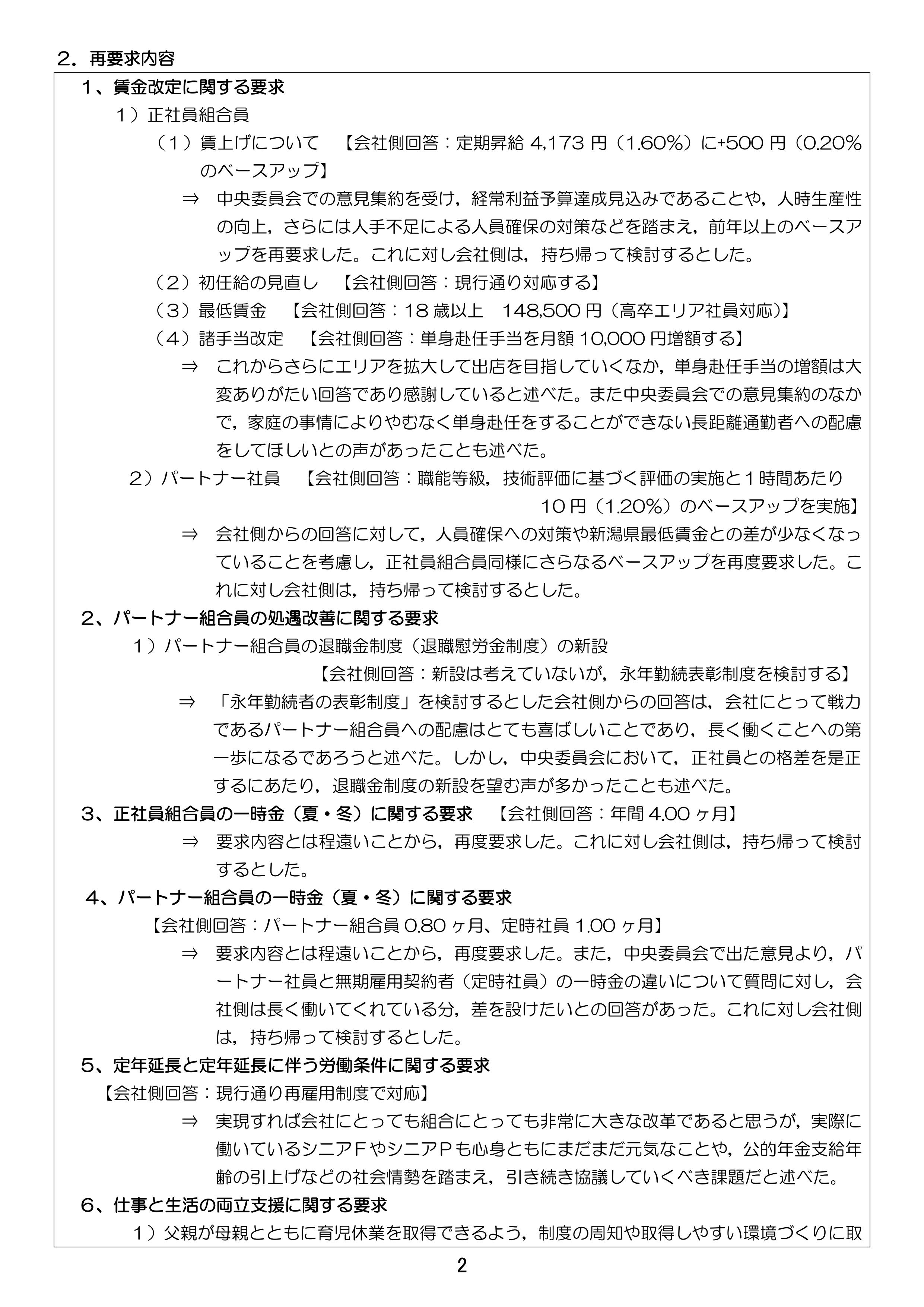 これに対し組合側は、賃上げや一時金については有額回答があったものの、要求内容とはほど遠い回答ではありましたが、単身赴任手当の増額,ひとり親のパートナー社員に対して家族手当の見直しなど待遇面での改善に対し一定の評価をしたうえで、この回答を持ち帰り中央委員会を開催した上で、次回の労使協議会にて再要求を行うこととしました。