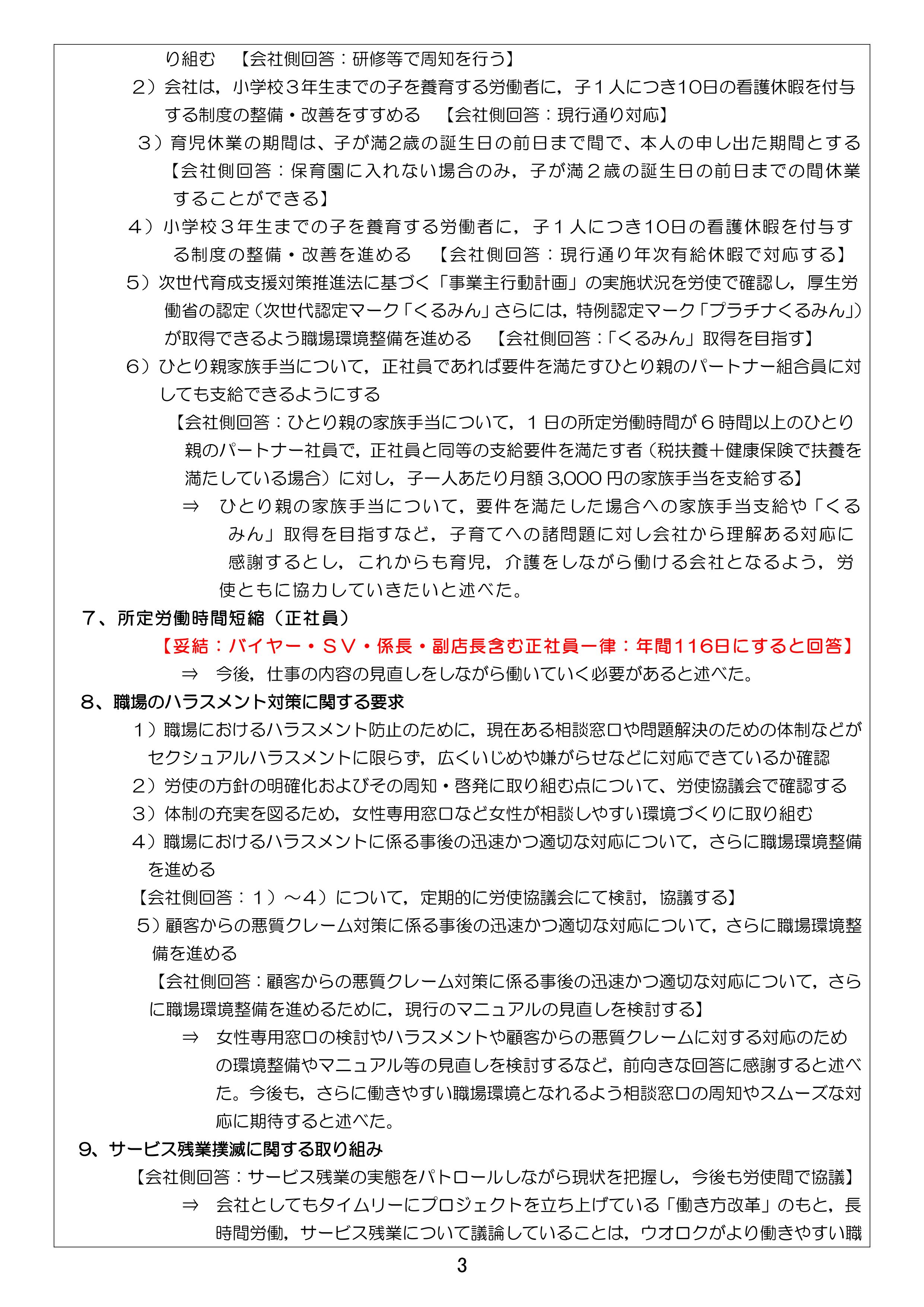 ⇒バイヤー,SV,副店長の年間休日が3日増えたことに対し喜ばしいこととし,今後はどうやって作業負担を軽減できるかを別途協議していくことを確認し,妥結に至りました。