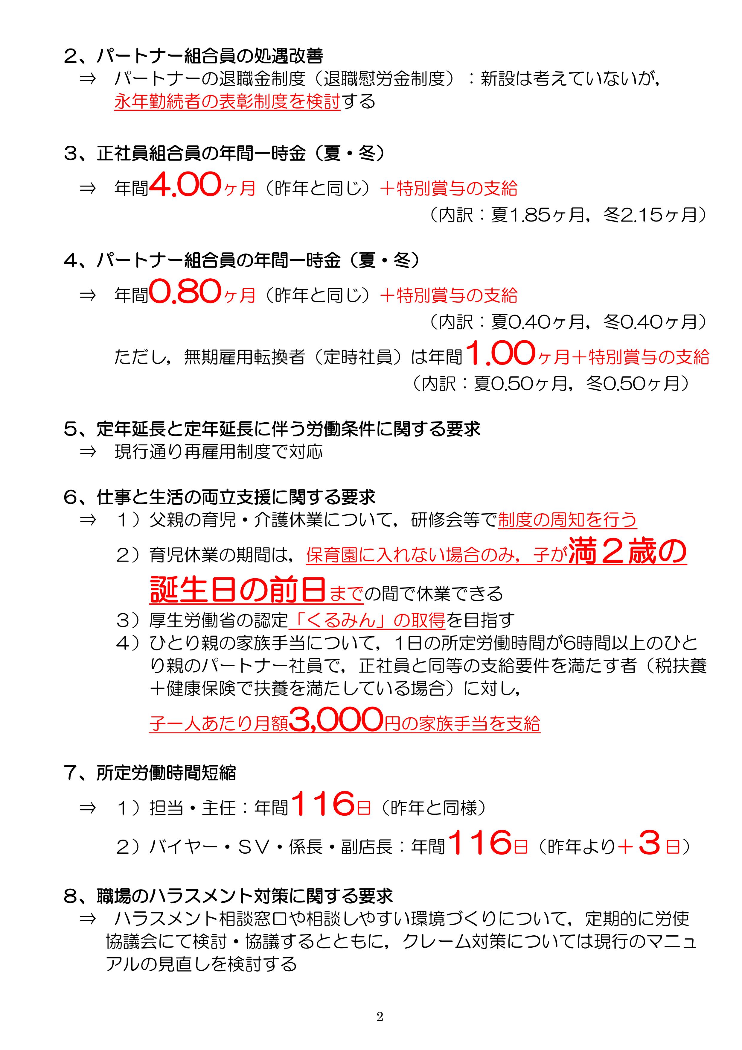 ならびに パートナー組合員の一時金(夏・冬)に関する要求【会社側回答:年間0.80ヶ月,但し無期雇用転換者(定時社員)は年間1.00ヶ月】