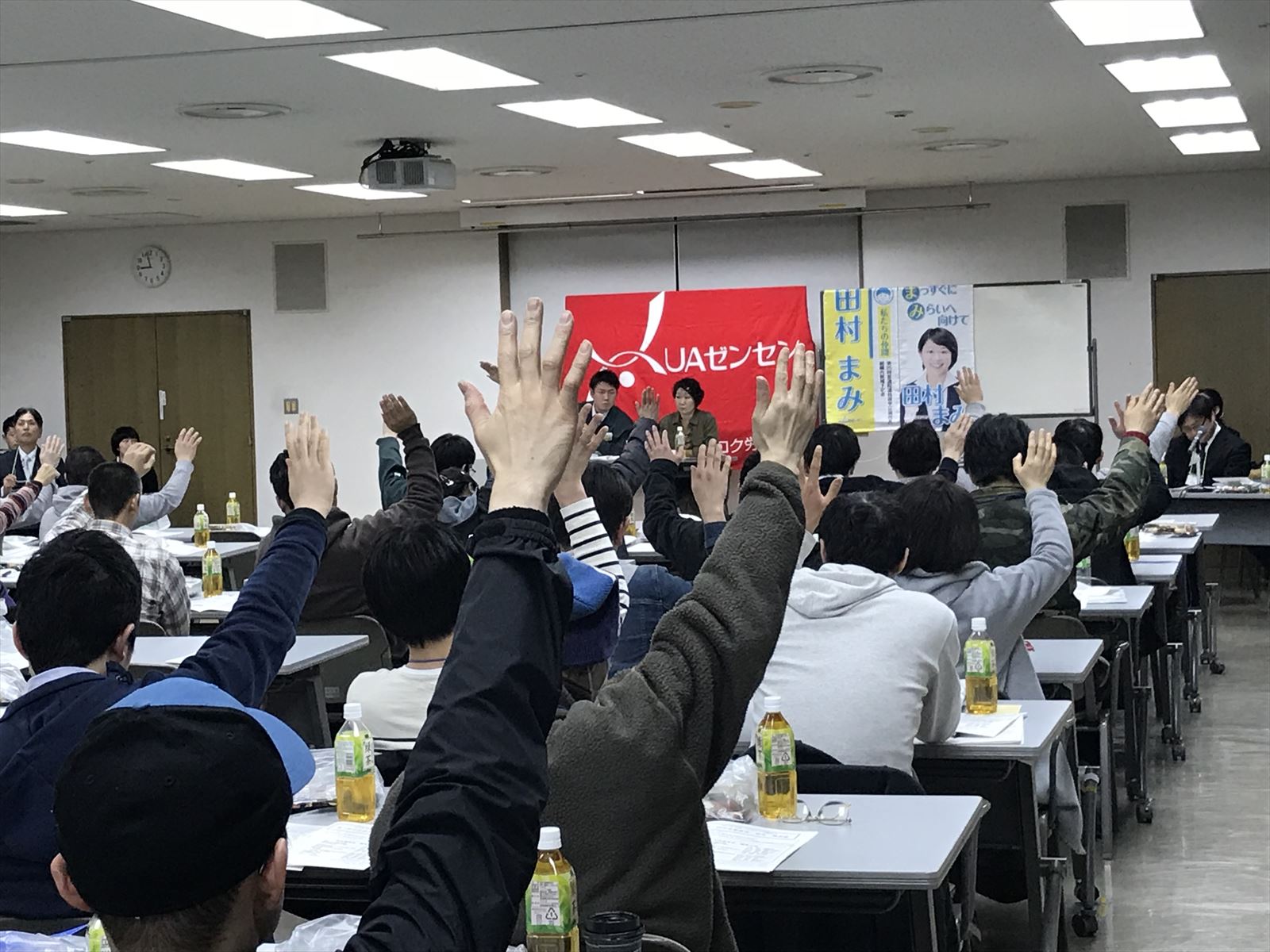 次に小舟戸書記長から「田村まみ後援会入会カード」について,「悪質クレーム問題」の署名活動について依頼があり,支部でのやり方について説明がありました。