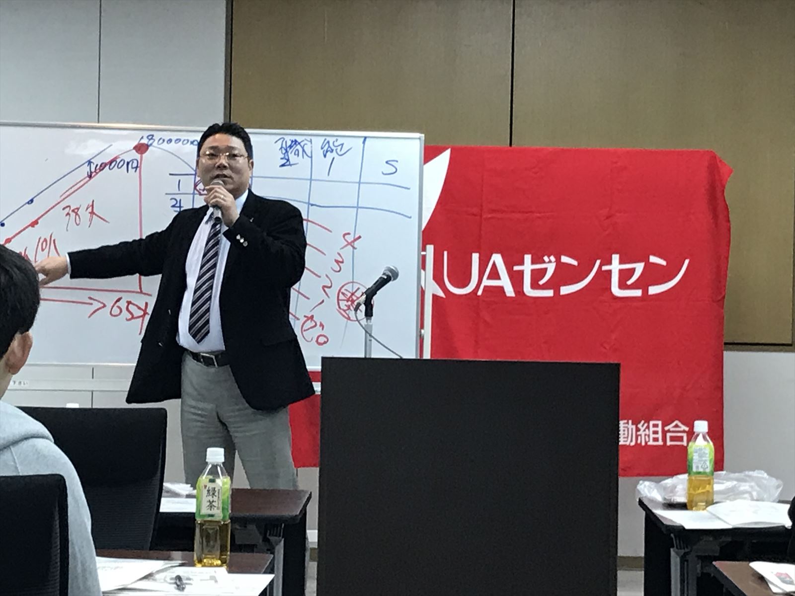 その後、UAゼンセン新潟県支部 蒲原次長さまから「賃金の組み立て方」についてお話ししていただき,賃金の基礎・仕組みについて勉強しました。また,ベースアップや定期昇給の仕組みについても教えていただきました。