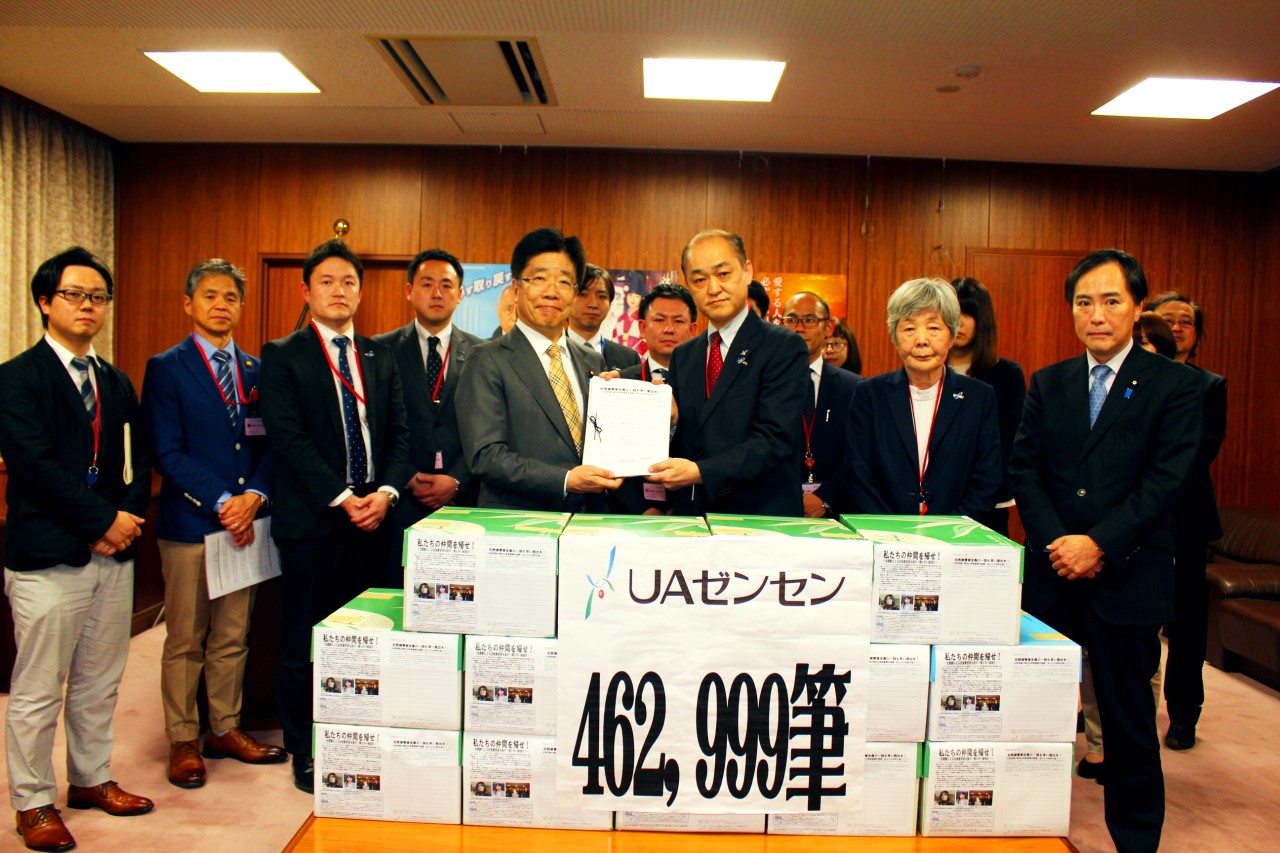 この1年間で過去最高の462,999筆(当組合2,478筆分含む)を,拉致被害者家族であり,UAゼンセン加盟の組合員家族でもある「大政 悦子」さんとともに届けられ,大政さんからは「拉致被害者全員が一刻も早く家族のもとに戻ってこれるよう,政府として行動してもらいたい」と強く訴えておりました。