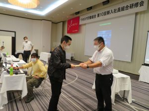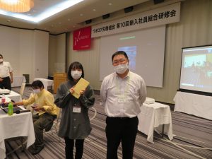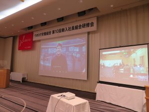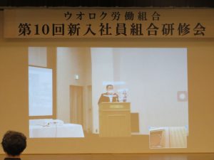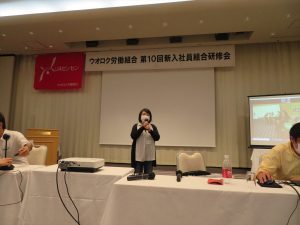 コロナ禍の中で,以前とは違いなかなか集まる機会も少ないれども,今日の研修会を有意義に過ごしてもらい,労働組合の活動にも触れて頂きながら過ごしてもらいたいとし,仕事を選ぶ中でスーパーを選んだことは,人生で素晴らしい選択だったと思い,自信をもって仕事に励んでもらいたいと述べ,仕事にも少しずつ慣れてきたこのタイミングで伝えたいと思っていたと述べ,ウオロクを選んでくれてありがとうと伝えました。