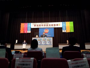 3月1日(火)に連合新潟主催の「2022賃金闘争・参議院議員選挙”必勝”新潟県中央総決起集会」が新潟ユニゾンプラザで開催され,那須野執行委員長から上部団体であるUAゼンセンを代表して,「2022総合労働条件闘争」勝利に向け決意表明を行いました。