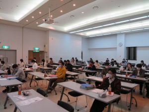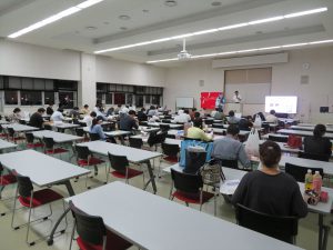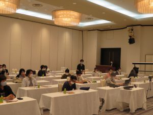 今回の組合研修会について,支部長会議同様に新型コロナウイルス感染症対策として,約60名が収容できる会場を用意し,各人の座席への配慮を行いながら開催しました。
