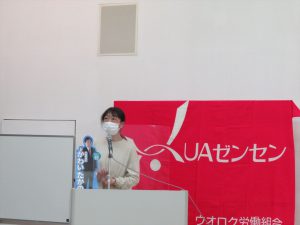 閉会の挨拶は浅田 久美子副委員長が行い,今回の支部長会議の議題であった”政治”の話は,皆さんはあまり興味がないことだと思うけれども,働いていく上での問題をクリアしていくために労使で解決できない問題については国政に働きかけることは必要であり,そのためには仲間の議員に頑張ってもらうしかないので,決して「興味がない!」と言わず,少しでも耳を傾けて興味をもってほしいと訴えた。