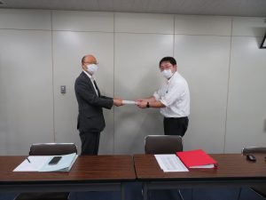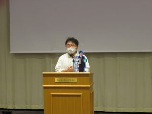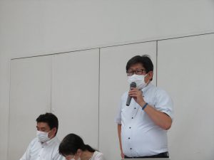 はじめに,那須野 紀浩執行委員長より挨拶があり,日頃の組合活動への参加の感謝を伝えたあと,昨今行っている自然災害についての恐怖や備えの重要性についてと,新型コロナウイルス感染症における近々の状況や変異株の広がりを考え,今回の夏の組合日帰り旅行が中止になってしまったことへの謝罪を述べた。