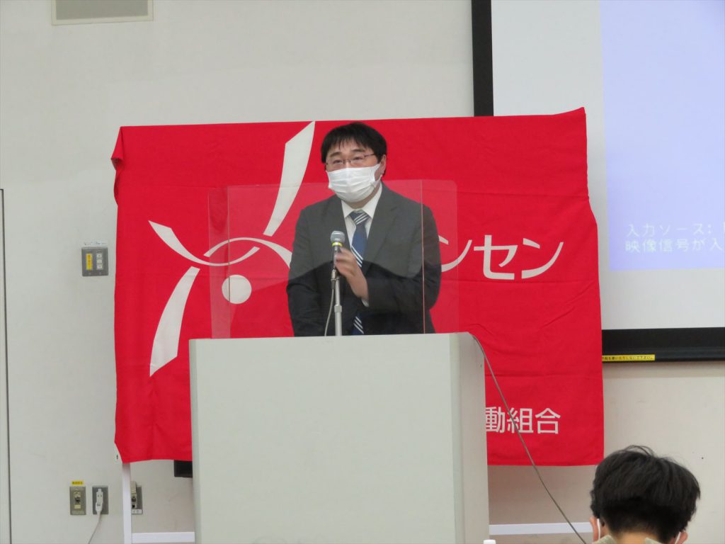 そしてこの後の議題のひとつでもある「給与明細の見方や支払っている税金や社会保険」について,会社と賃金条件交渉を行っていく中,自分のお金がどうなっているのか考えて,自身の給与明細を見直す機会としてひとつでも参考になれれば光栄であると話しました。