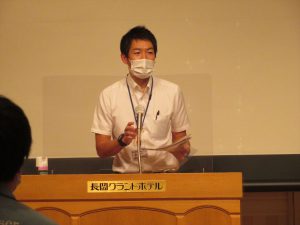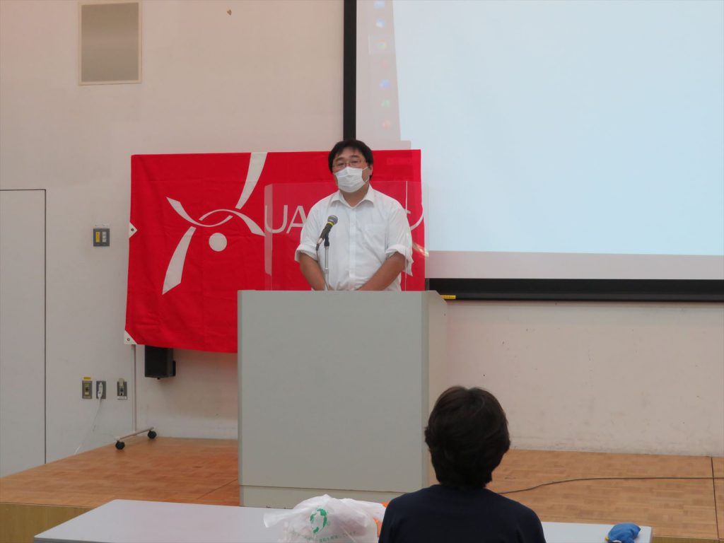はじめに那須野 紀浩執行委員長より挨拶があり,「コロナ禍の中で頑張って業務に励んで頂いていることへの感謝」「スローガンである長時間労働の撲滅と働きやすい職場づくりにするためのご協力のお願い」,そして「今年度の新入社員に対するフォローが足りていないので,支部長・副支部長からも新入社員に話しかけるなどして気にかけてもらいたい」とお願いがありました。
