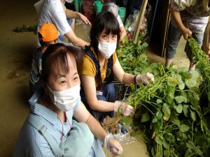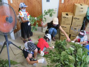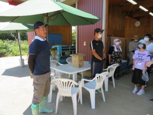 茶豆捥ぎ取り体験では,新潟市西区黒鳥の㈱本間商事さんにお世話になり,茶豆収穫についての説明や朝採ったばかりの枝豆を枝から捥ぎ取る作業を体験させていただきました。