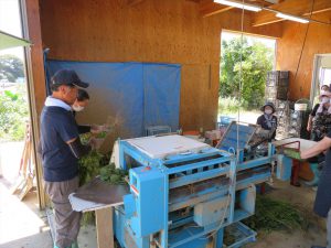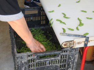 捥ぎ取り作業について,現在は機械を使って1時間に150kg程の枝豆をもぐことが可能だそうですが,昔は全て手作業で行っていたため,とても大変だったとのことです。短い時間ではありましたが,その作業を身をもって体験できたことで,自分で捥いだ枝豆を家に帰ってから茹で,味わった時の美味しさもまたひとしおでした。