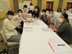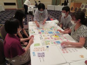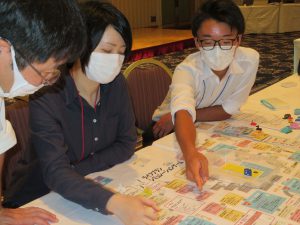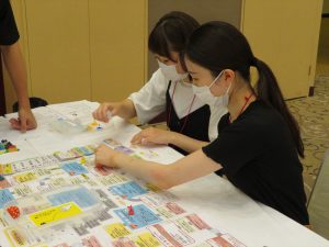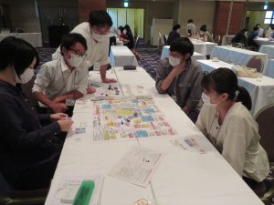 労働組合ライフプランシミュレーションゲームでは,いわゆるボードゲームの「人生ゲーム」のような形式のゲームを用いて,労働組合や保険・共済が働いていく上で大切になってくることを学ぶことが出来ました。各テーブルからは,ゲームを楽しみながら盛り上がっている雰囲気が伝わってきて,学ぶことと同時に,各々の交流も深めることが出来たのではないかと思います。