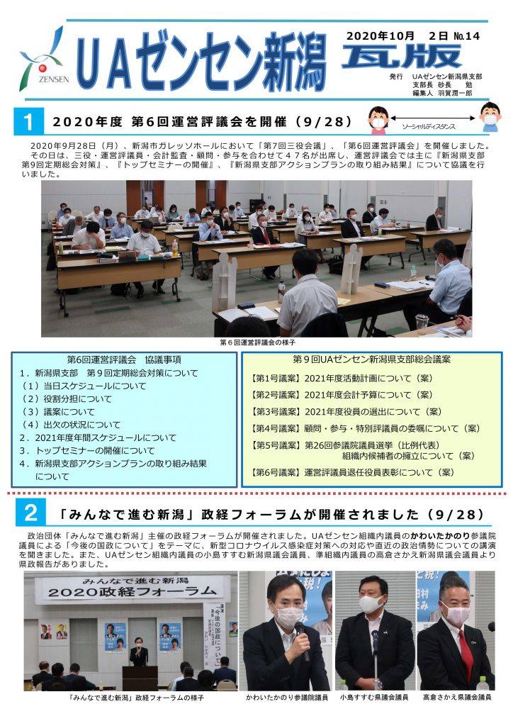9月28日(月),私たち労働組合の上部団体であるUAゼンセン新潟県支部の「2020年度 第6回運営評議会」が新潟市中央区のガレッソホールにて開催され,当組合から運営評議員として那須野執行委員長,会計監査として小舟戸書記長が出席し,おもに「第9回定期総会対策」「トップセミナー対策」など確認を行いました。終了後,みんなで進む新潟主催の政経フォーラムが開催され,UAゼンセン組織内議員であるかわい たかのり参議院議員より「今後の国政について」わかりやすくお話していただきました。