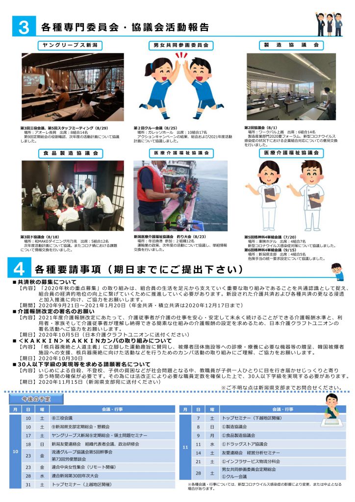 その他,今後の活動予定の連携として,定時社員・パートナー社員の職能等級評価表の見直しを行っており,何か意見があれば連絡してほしいこと,夏の組合日帰り旅行は,コロナ対策をしっかり行ったうえで実施すること,そして9月9日(水)には新入社員組合研修会,9月23日(水)に組合研修会を日帰りにて開催することをお伝えし,新型コロナウイルス感染症など不安な点もあると思うが,参加できそうであればぜひ参加していただきたいと呼びかけました。